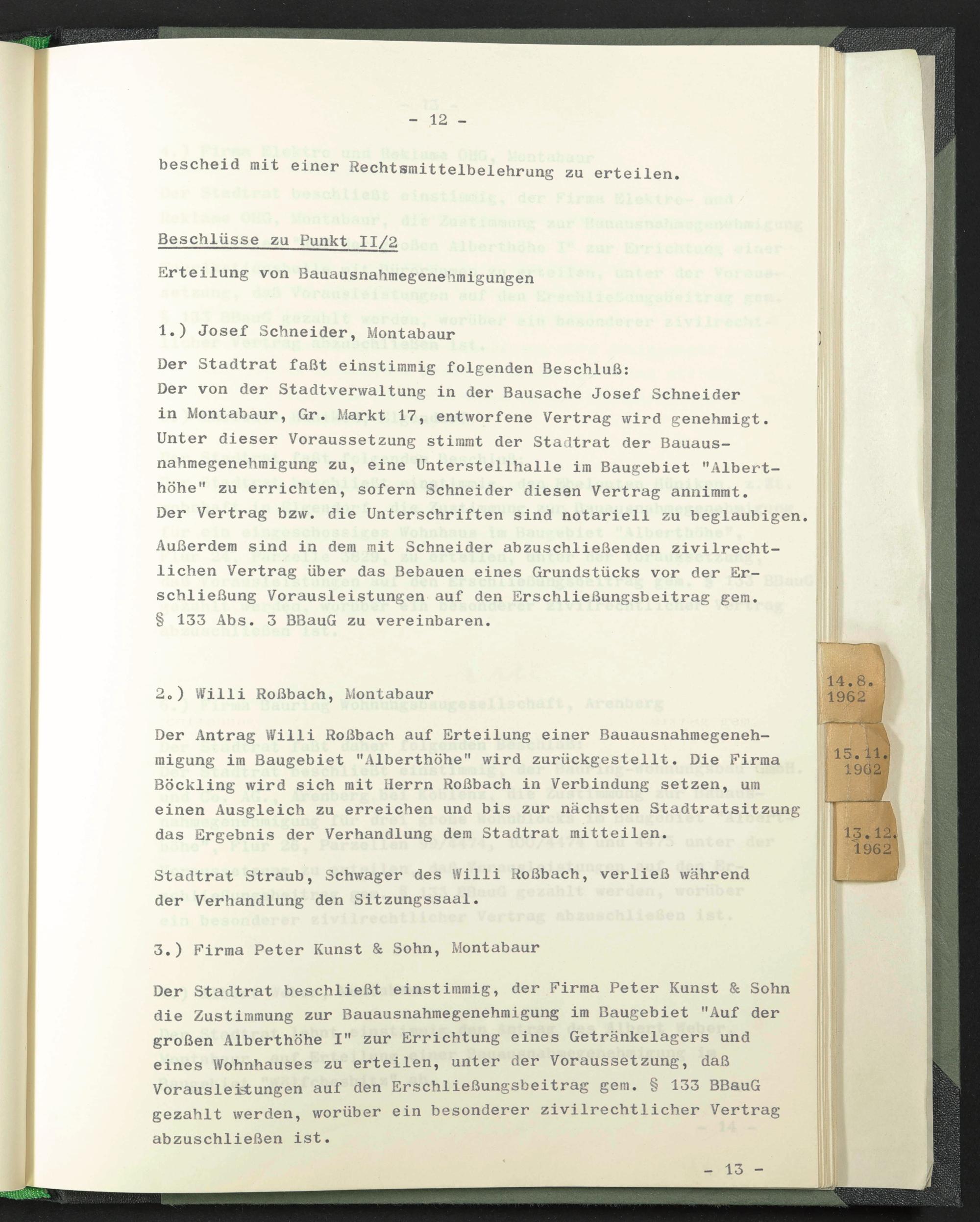 Der von der Stadtverwaltung in der Bausache Josef Schneider in Montabaur, Gr. Markt 17, entworfene Vertrag wird genehmigt. Unter dieser Voraussetzung stimmt der Stadtrat der Bauausnahmegenehmigung zu, eine Unterstellhalle im Baugebiet "Alberthöhe" zu errichten, sofern Schneider diesen Vertrag annimmt.