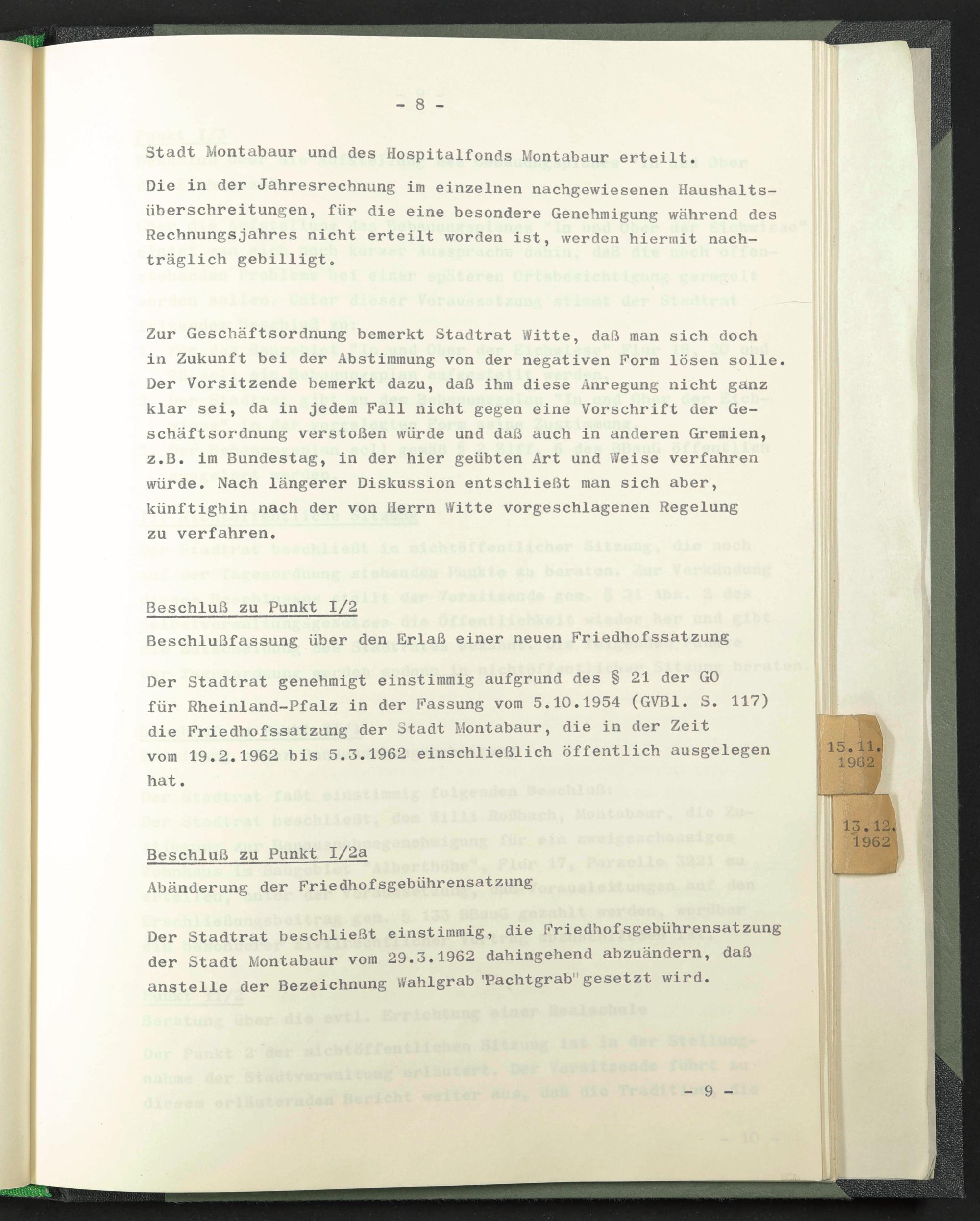Der Stadtrat genehmigt einstimmig aufgrund des § 21 der GO für Rheinland-Pfalz in der Fassung vom 5.10.1954 (GVB1. S. 117) die Friedhofssatzung der Stadt Montabaur, die in der Zeit vom 19.2.1962 bis 5.3.1962 einschließlich öffentlich ausgelegen hat.