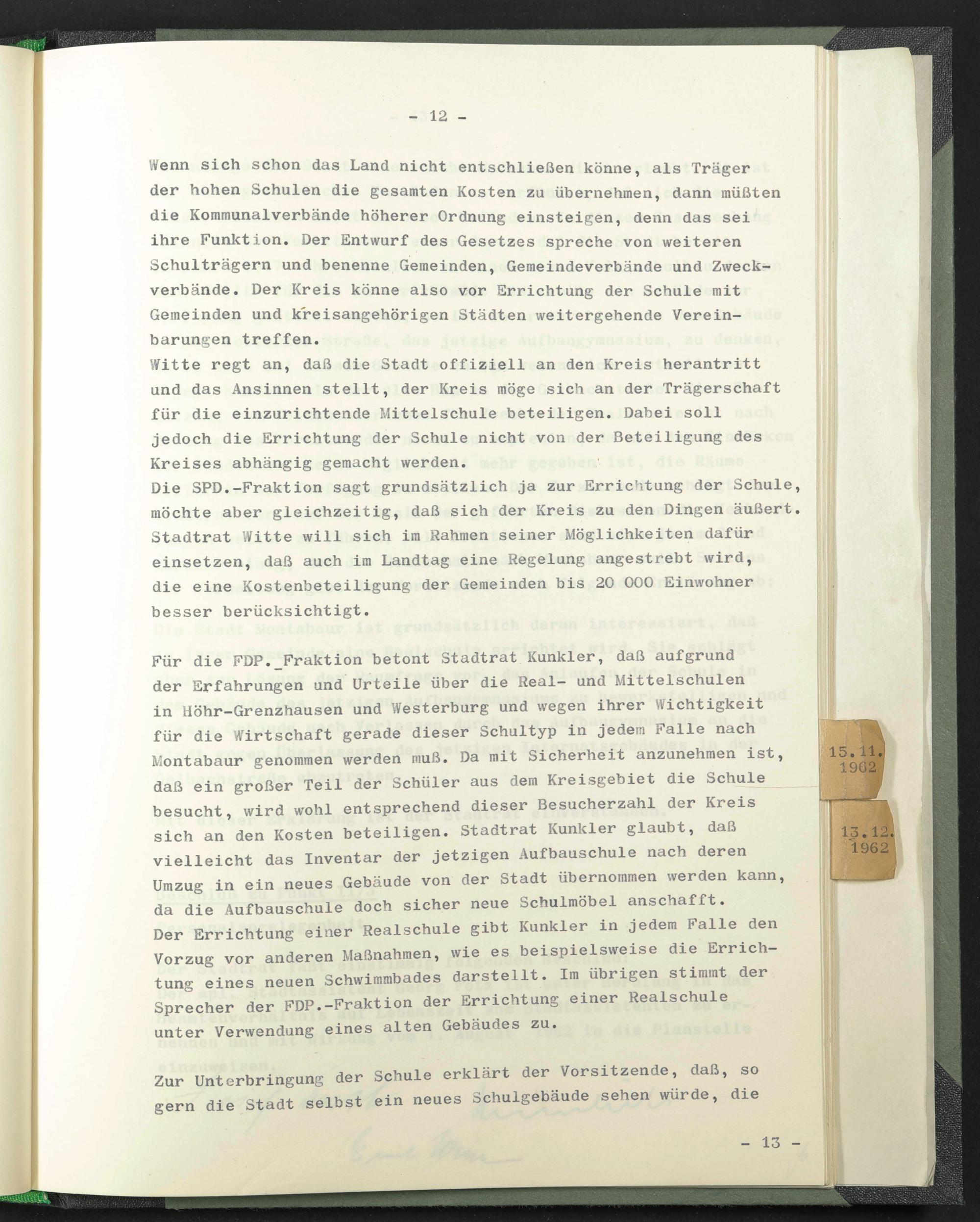 Für die FDP.Fraktion betont Stadtrat Kunkler, daß aufgrund der Erfahrungen und Urteile über die Real— und Mittelschulen in Höhr-Grenzhausen und Westerburg und wegen ihrer Wichtigkeit für die Wirtschaft gerade dieser Schultyp in jedem Falle nach Montabaur genommen werden muß. Da mit Sicherheit anzunehmen ist, daß ein großer Teil der Schüler aus dem Kreisgebiet die Schule besucht, wird wohl entsprechend dieser Besucherzahl der Kreis sich an den Kosten beteiligen. Stadtrat Kunkler glaubt, daß vielleicht das Inventar der jetzigen Aufbauschule nach deren Umzug in ein neues Gebäude von der Stadt übernommen werden kann, da die Aufbauschule doch sicher neue Schulmöbel anschafft.