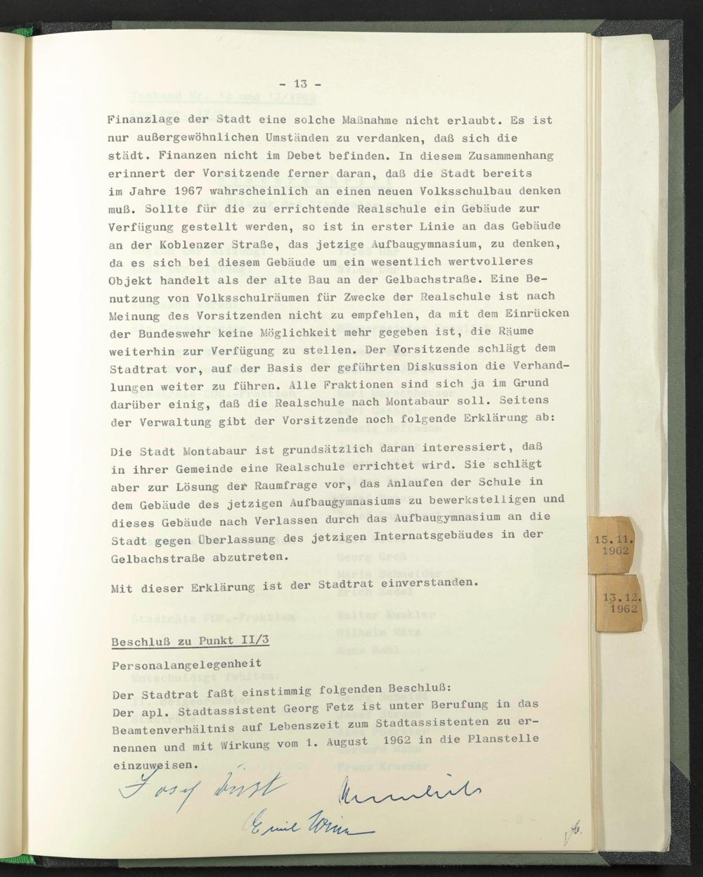Der apl. Stadtassistent Georg Fetz ist unter Berufung in das Beamtenverhältnis auf Lebenszeit zum Stadtassistenten zu ernennen und mit Wirkung vom 1. August 1962 in die Planstelle