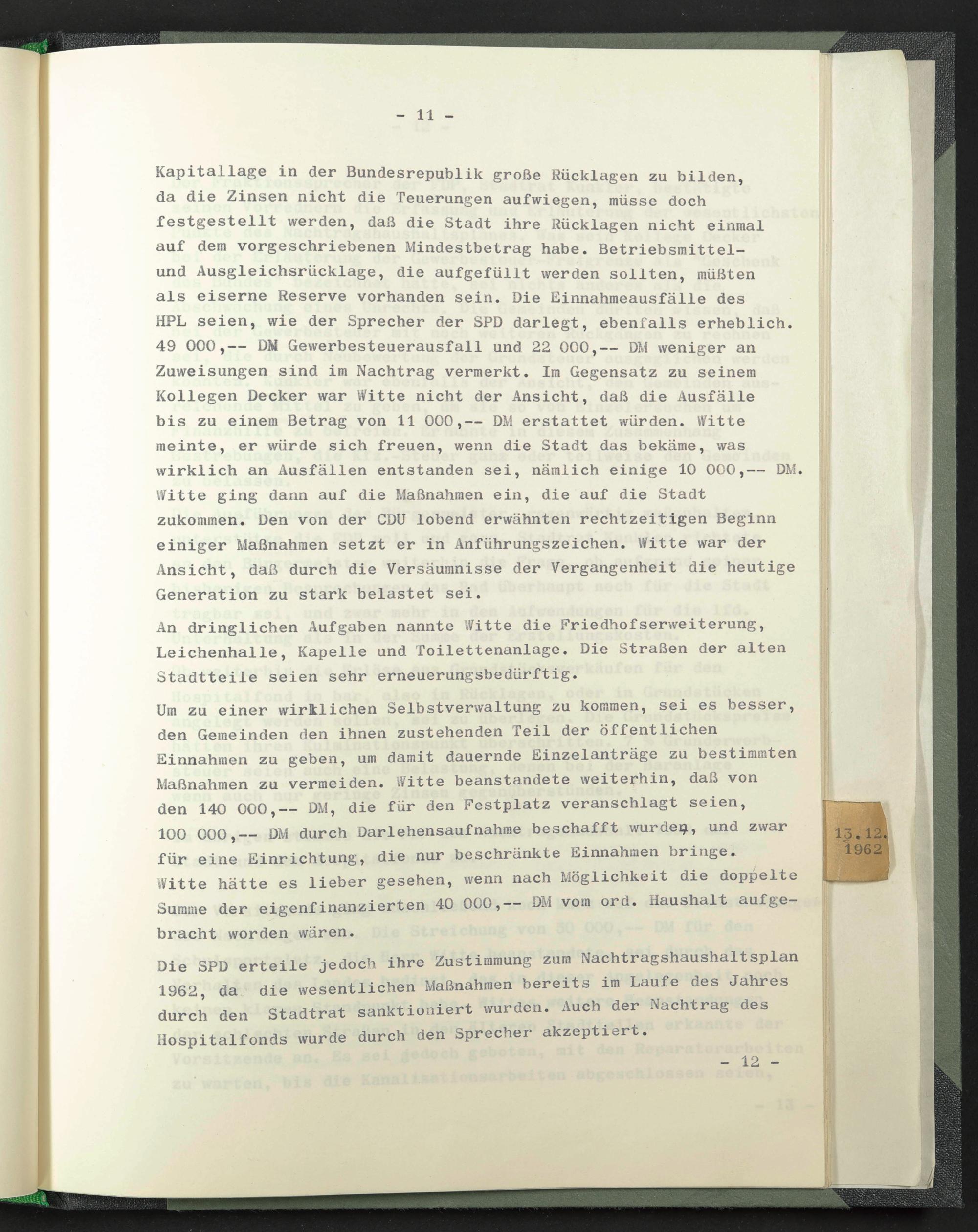 SPD erteile jedoch ihre Zustimmung zum Nachtragshaushaltsplan 1962 da die wesentlichen Maßnahmen bereits im Laufe des Jahres durch den Stadtrat sanktioniert wurden. Auch der Nachtrag des Hospitalfonds wurde durch den Sprecher akzeptiert.