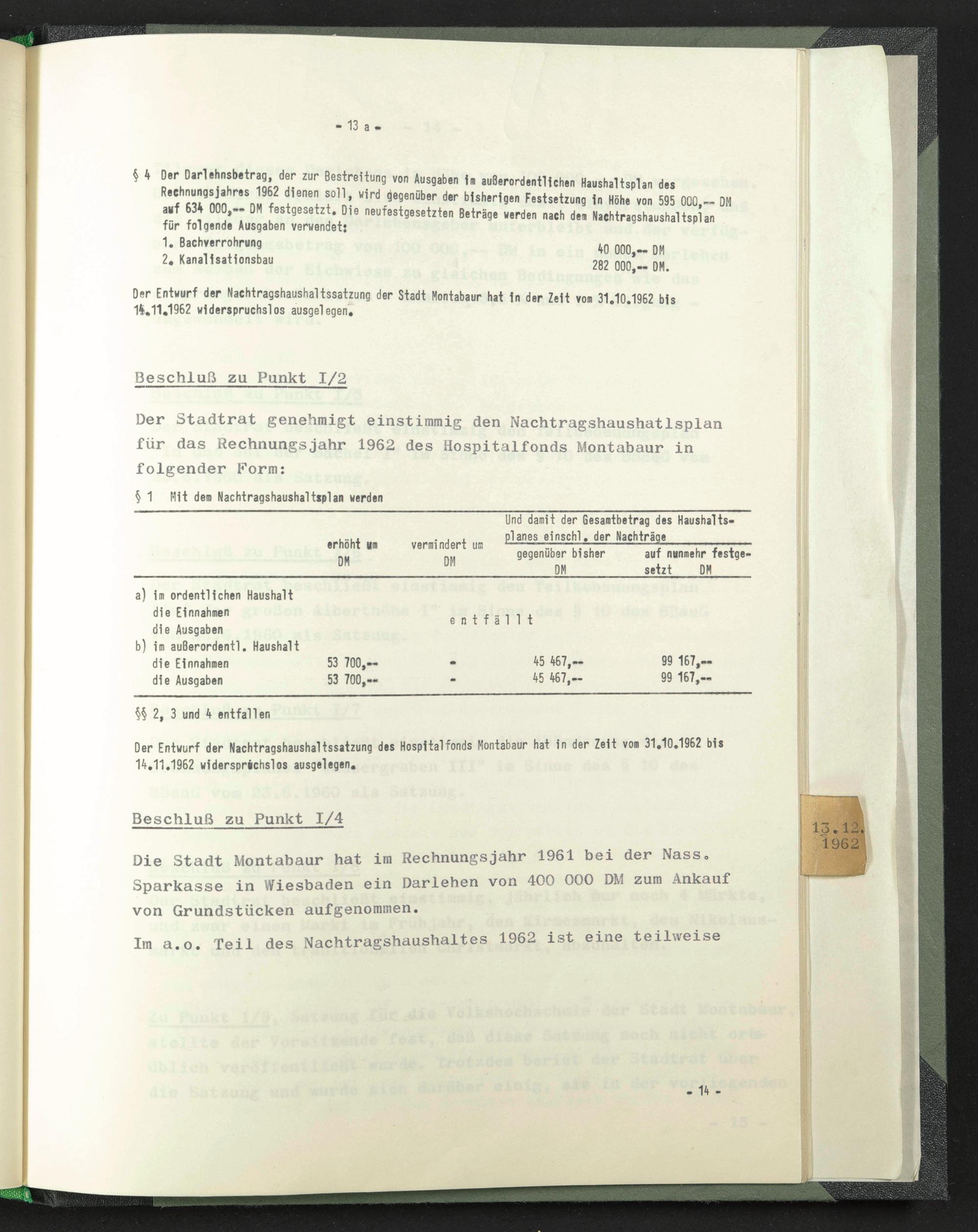 Der Stadtrat genehmigt einstimmig den Nachtragshaushatlsplan für das Rechnungsjahr 1962 des Hospitalfonds Montabaur in folgender Form: