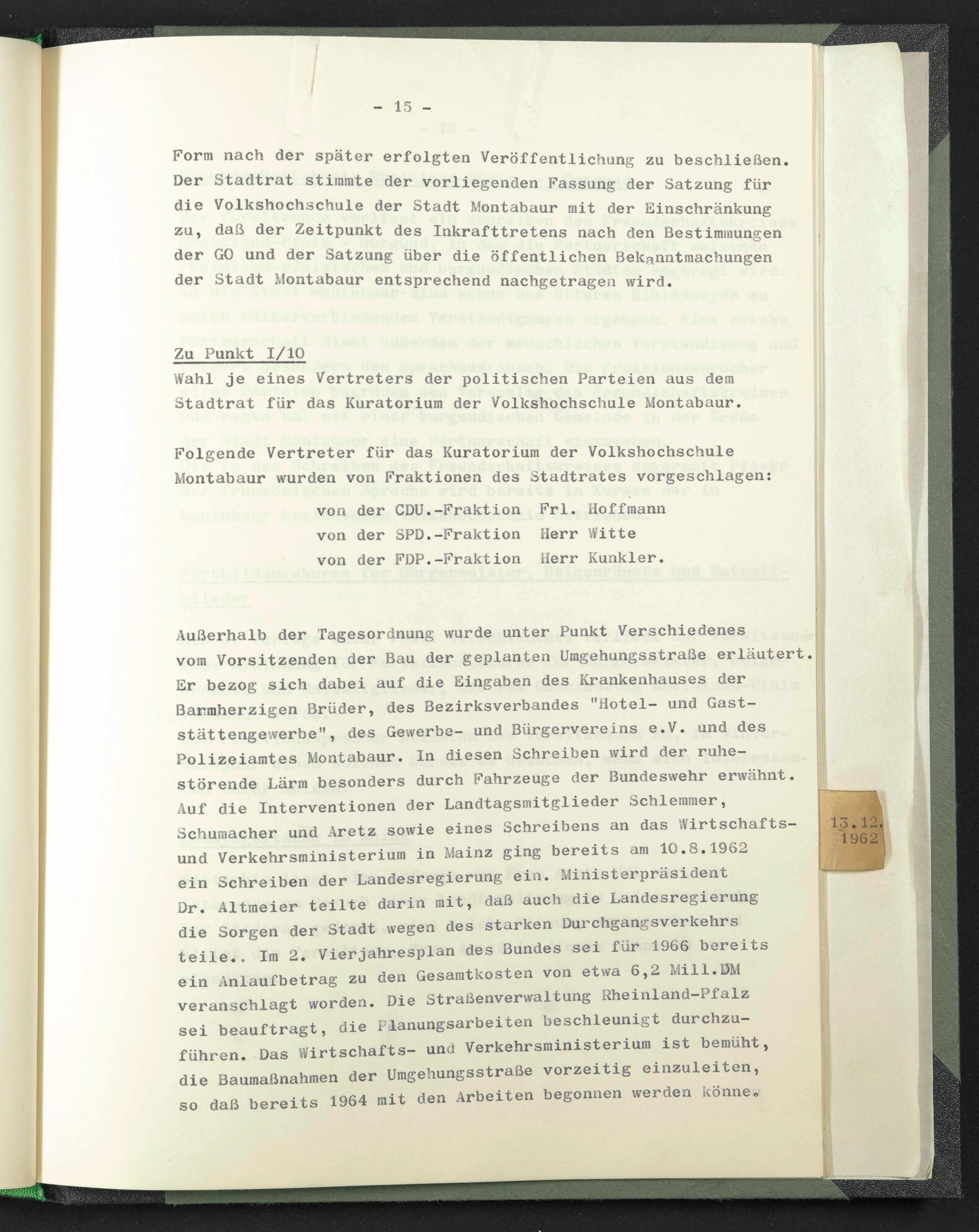 Außerhalb der Tagesordnung wurde unter Punkt Verschiedenes vom Vorsitzenden der Bau der geplanten Umgehungsstraße erläutert. Er bezog sich dabei auf die Eingaben des Krankenhauses der Barmherzigen Brüder, des Bezirksverbandes "Hotel— und Gaststättengewerbe", des Gewerbe- und Bürgervereins e.V. und des Polizeiamtes Montabaur. In diesen Schreiben wird der ruhestörende Lärm besonders durch Fahrzeuge der Bundeswehr erwähnt. Auf die Interventionen der Landtagsmitglieder Schlemmer, Schumacher und Aretz sowie eines Schreibens an das Wirtschafts— und Verkehrsministerium in Mainz ging bereits am 10.8.1962 ein Schreiben der Landesregierung ein. Ministerpräsident Dr. Altmeier teilte darin mit, daß auch die Landesregierung ctle Sorgen der Stadt wegen des starken Dui chgangsverkehrs teile.. Im 2. Vierjahresplan des Bundes sei für 1966 bereits ej^ Aniaufbetrag zu den Gesamtkosten von etwa 6,2 Mill.DM veranschlagt worden. Die Straßenverwaltung Rheinland—Pfalz sei beauftragt, die Planungsarbeiten beschleunigt durchzu— führen. Das Wirtschafts- und Verkehrsministerium ist bemüht, die Baumaßnahmen der Umgehungsstraße vorzeitig einzuleiten, so daß bereits 1964 mit den Arbeiten begonnen werden könne.