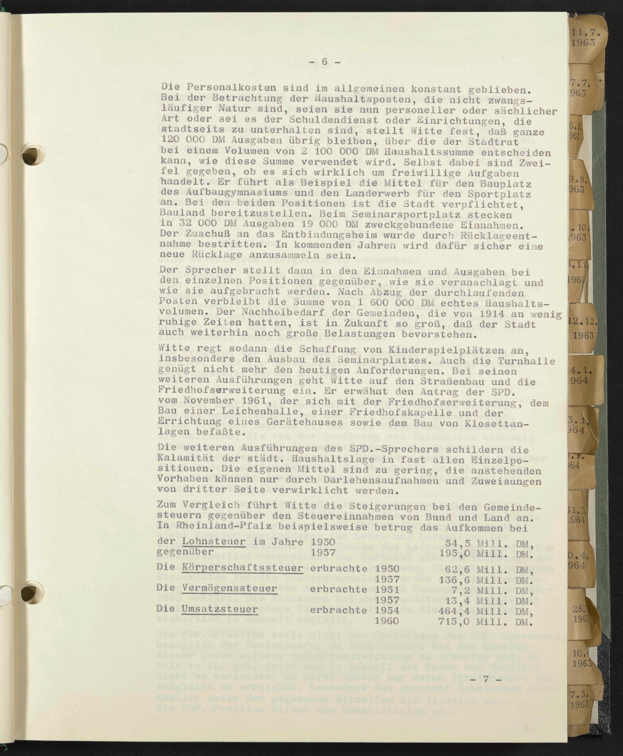 Bei der Betrachtung der Haushaltsposten, die nicht zwangsläufiger Natur sind, seien sie nun personeller oder sächlicher Art oder sei es der Schuldendienst oder Einrichtungen, die stadtseits zu unterhalten sind, stellt Witte fest, daß ganze 120 000 DM Ausgaben übrig bleiben, über die der Stadtrat bei einem Volumen von 2 100 000 DM Haushaltssumme entscheiden kann, wie diese Summe verwendet wird. Selbst dabei sind Zweifel gegeben, ob es sich wirklich um freiwillige Aufgaben handelt. Er führt als Beispiel die Mittel für den Bauplatz des Aufbaugymnasiums und den Landerwerb für den Sportplatz an. Bei den beiden Positionen ist die Stadt verpflichtet, Bauland bereitzustellen. Beim Seminarsportplatz stecken in 32 000 DM Ausgaben 19 000 DM zweckgebundene Einnahmen.