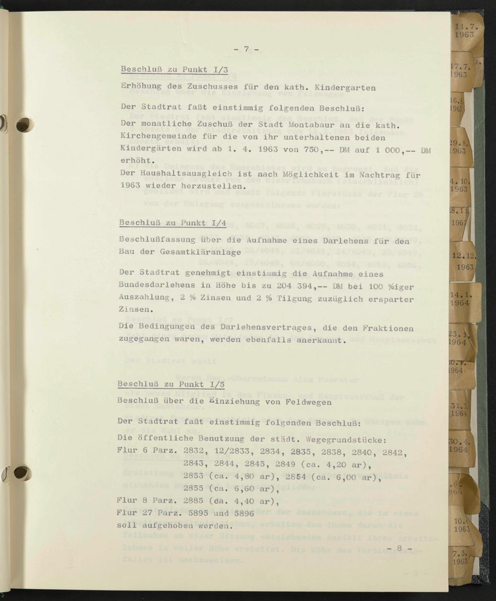 Der monatliche Zuschuß der Stadt Montabaur an die kath. Kirchengemeinde für die von ihr unterhaltenen beiden Kindergärten wird ab 1. 4. 1963 von 750,— DM auf 1 000,— DM erhöht.
