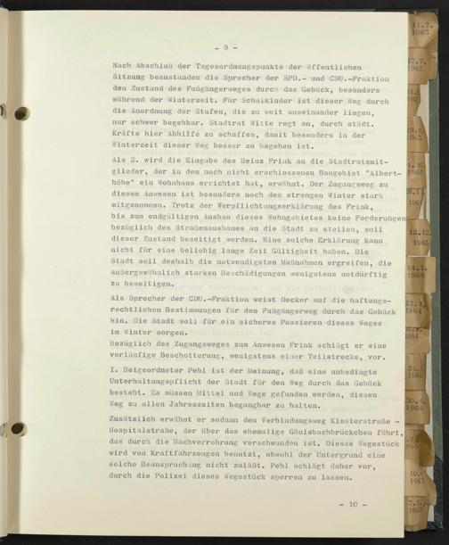 Nach Abschluß der Tagesordnungspunkte der öffentlichen Sitzung beanstanden die Sprecher der SPD.- und CDU.-Fraktion den Zustand des Fußgängerweges durch das Gebäck, besonders während der Winterzeit. Für Schulkinder ist dieser Weg durch die Anordnung der Stufen, die zu weit auseinander liegen, nur schwer begehbar. Stadtrat Witte regt an, durch städt.