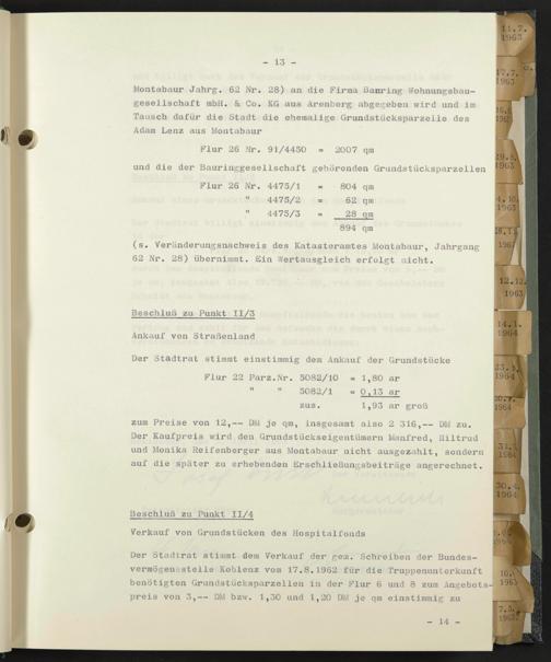 Der Stadtrat stimmt dem Verkauf der gern. Schreiben der Bundesvermögensstelle Koblenz vom 17.8.1962 für die Truppenunterkunft benötigten Grundstücksparzeilen in der Flur 6 und 8 zum Angebots preis von 3,— DM bzw. 1,30 und 1,20 DM je qm einstimmig zu
