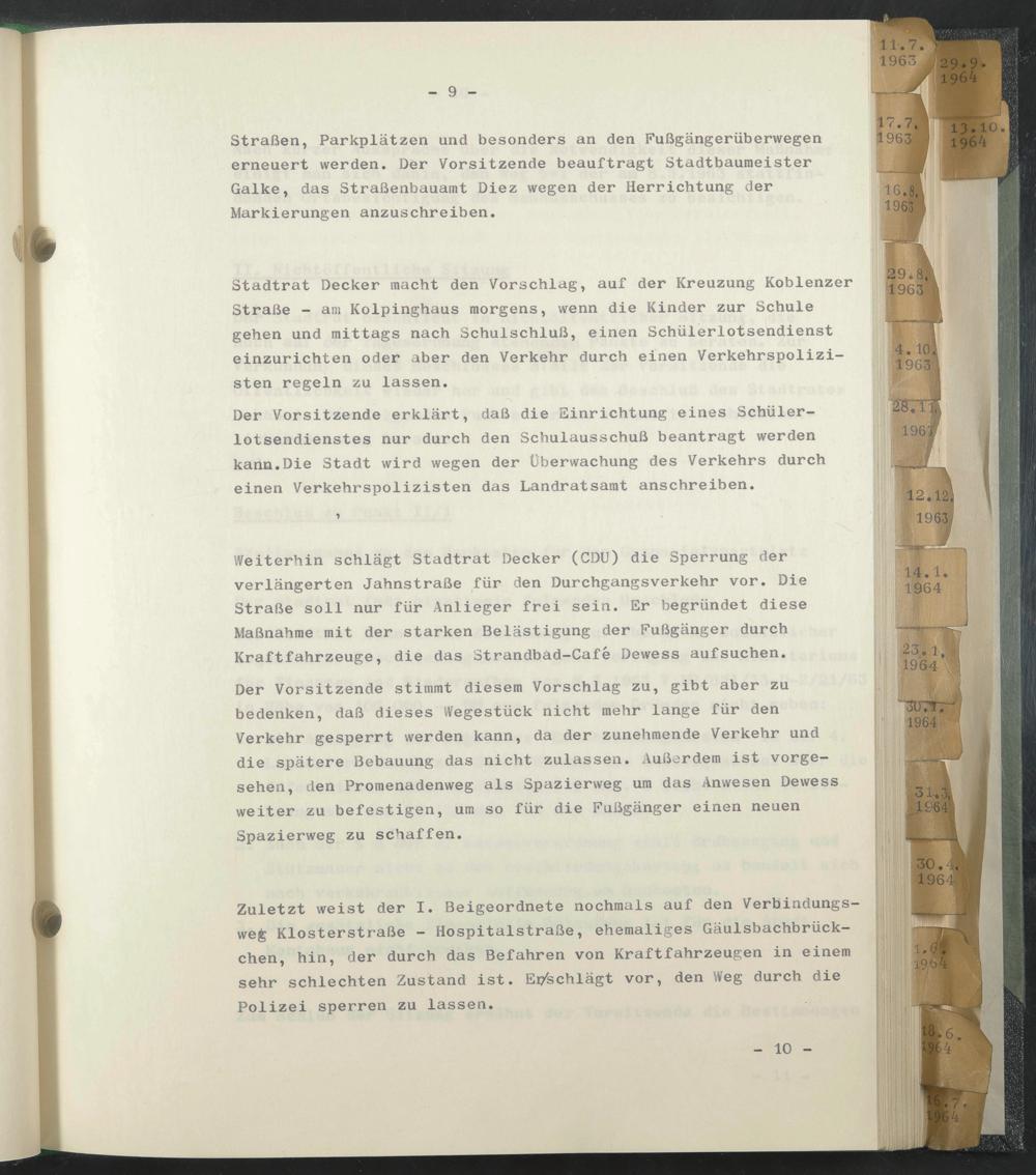 Stadtrat Decker macht den Vorschlag, auf der Kreuzung Koblenzer Straße - am Kolpinghaus morgens, wenn die Kinder zur Schule gehen und mittags nach Schulschluß, einen Schüierlotsendienst einzurichten oder aber den Verkehr durch einen Verkehrspolizisten regeln zu lassen.