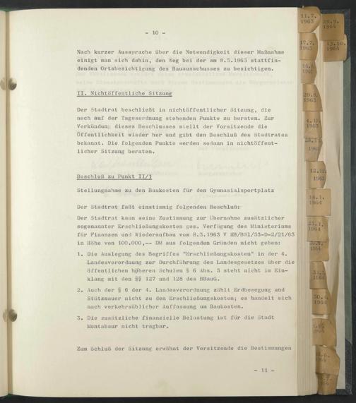 Der Stadtrat kann seine Zustimmung zur Übernahme zusätzlicher sogenannter Erschließungskosten gern. Verfügung des Ministeriums für Finanzen und Wiederaufbau vom 8.3.1963 V HB/BW1/33-D-2/21/63 in Höhe von 100.000,— DM aus folgenden Gründen nicht geben: