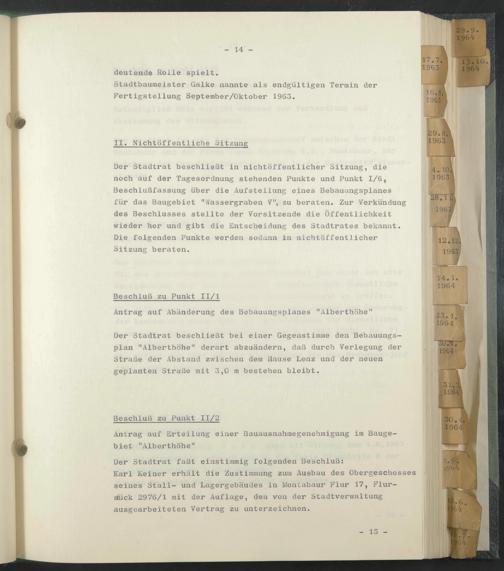 Der Stadtrat beschließt bei einer Gegenstimme den Bebauungsplan "Alberthöhe" derart abzuändern, daß durch Verlegung der Straße der Abstand zwischen dem Hause Lenz und der neuen geplanten Straße mit 3,0 m bestehen bleibt.