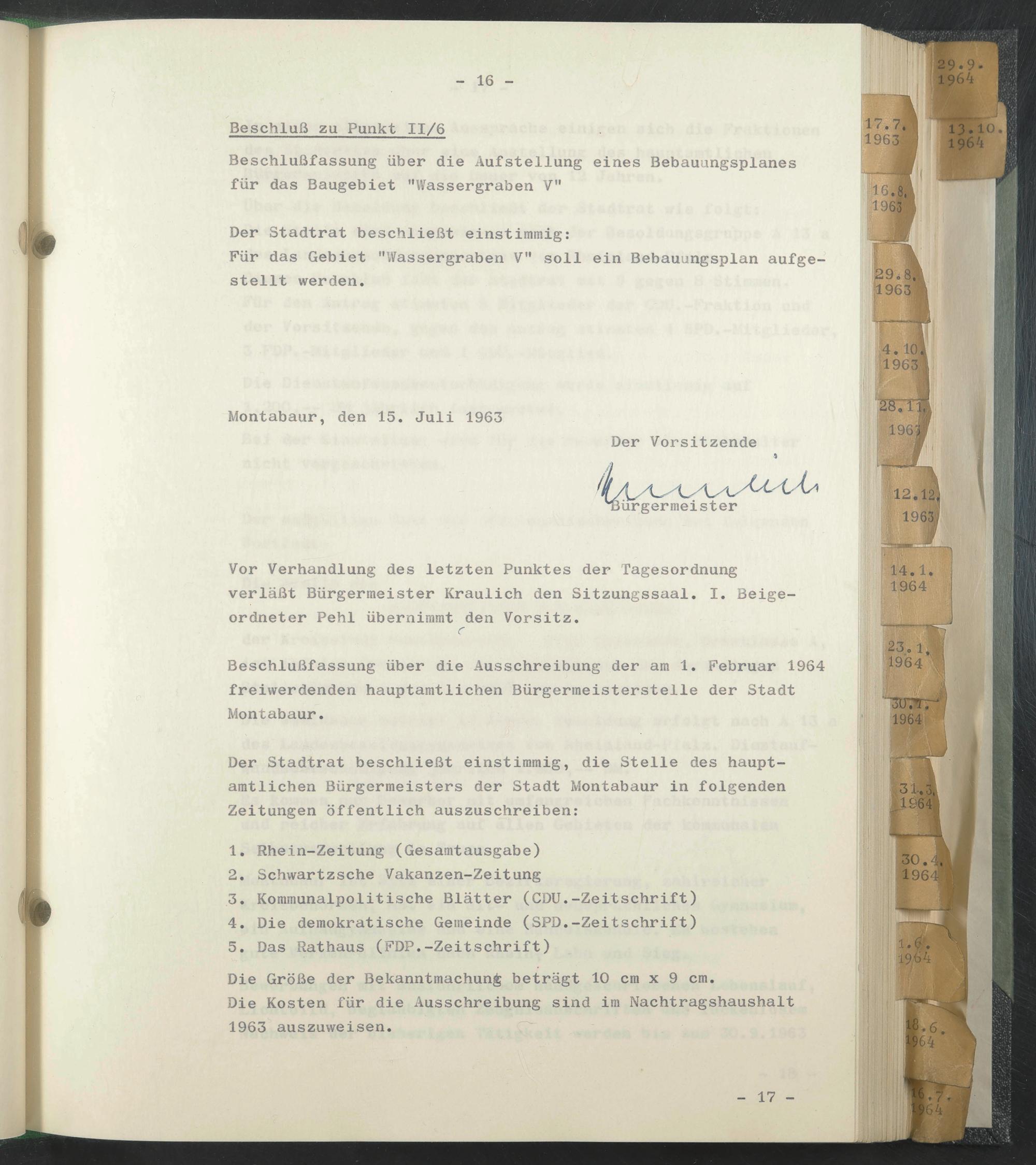 Beschlußfassung über die Ausschreibung der am 1. Februar 1964 freiwerdenden hauptamtlichen Bürgermeisterstelle der Stadt Montabaur.