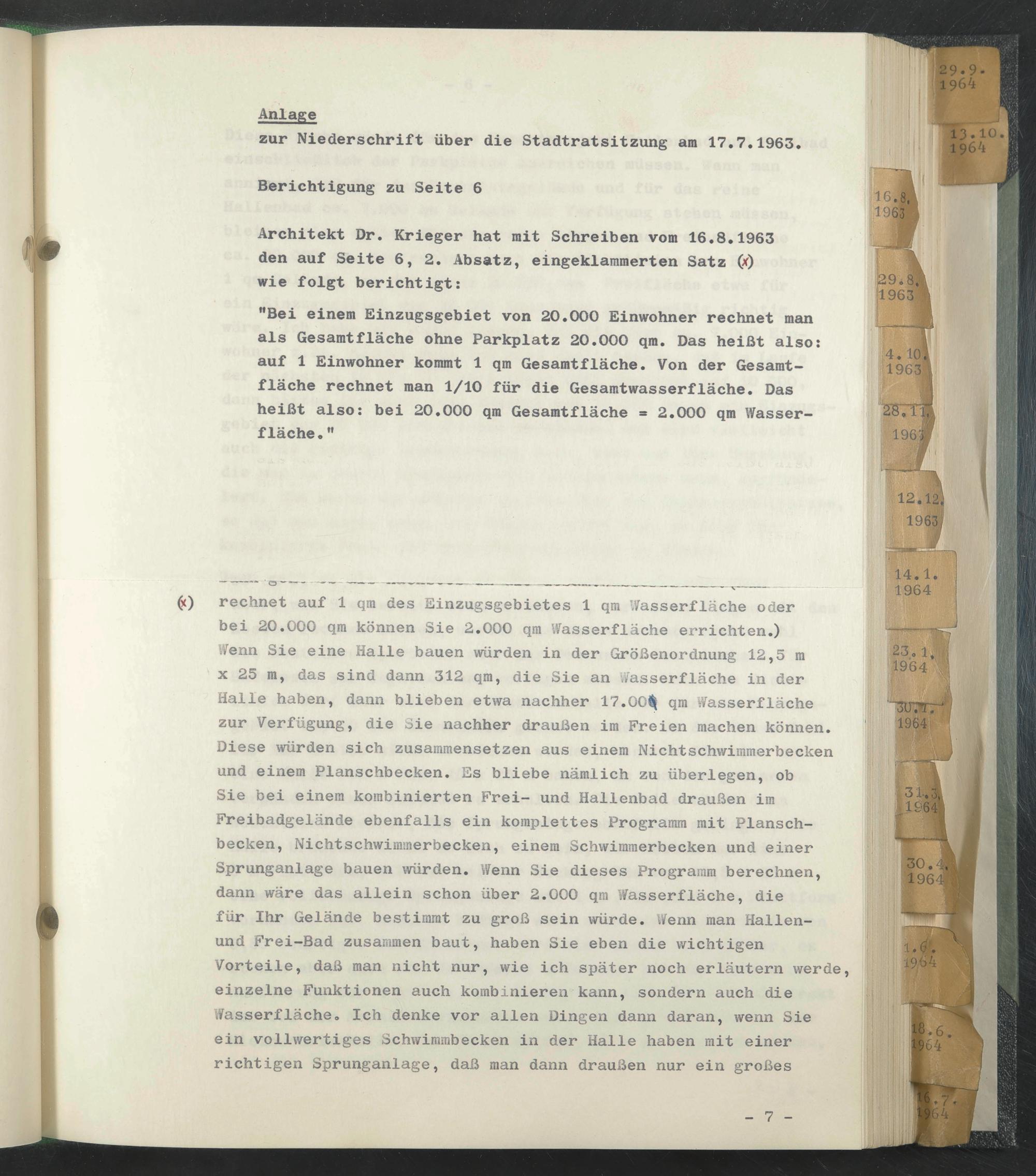 Architekt Dr. Krieger hat mit Schreiben vom 16.8.1963 den auf Seite 6, 2. Absatz, eingeklammerten Satz (f) wie folgt berichtigt: