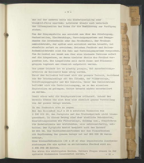 Bei dem Hallenbad 12,5 x 25 m entstehen Baukosten von 2 350 000 DM; den Parkplatz und das Freibadgelände nicht hinzugerechnet. In diesem Betrag sind aber sämtliche Nebenkosten, Einrichtungskosten wie Filteranlage, Heizung usw., Baugebühren für Badefachleute und Architekten, also schlüsselfertig, enthalten. Der Parkplatz kostet komplett nach dem Entwurf 65 000 DM. Das Nichtschwimmerbecken mit dem Planschbecken mit Bepflanzung der ganzen Anlage ist auf 800 000 DM veranschlagt .