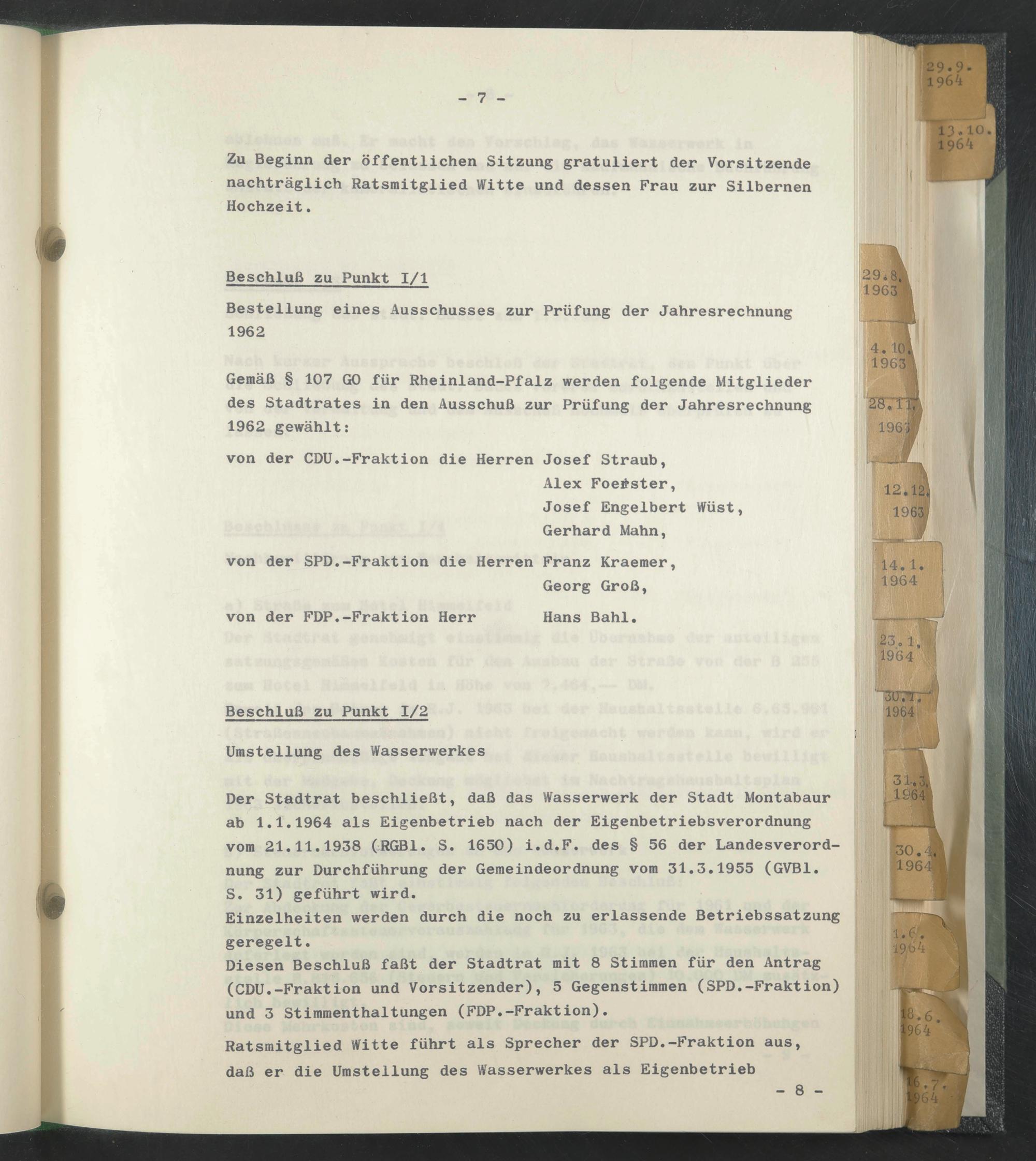 Gemäß § 107 GO für Rheinland-Pfalz werden folgende Mitglieder des Stadtrates in den Ausschuß zur Prüfung der Jahresrechnung 1962 gewählt:
