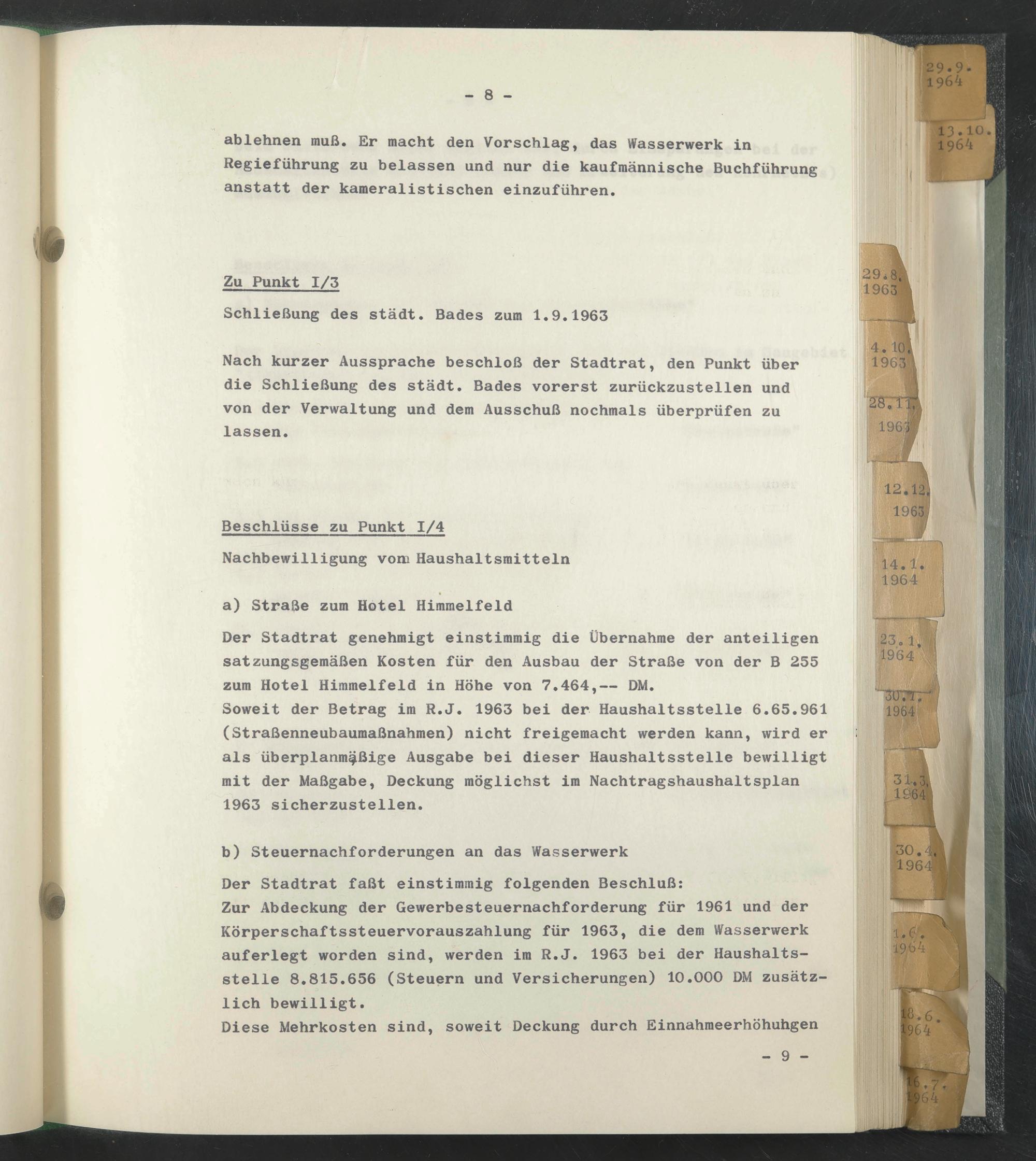 Zur Abdeckung der Gewerbesteuernachforderung für 1961 und der Körperschaftssteuervorauszahlung für 1963, die dem Wasserwerk auferlegt worden sind, werden im R.J. 1963 bei der Haushalts- stelle 8.815.656 (Steuern und Versicherungen) 10.000 DM zusätzlich bewilligt.