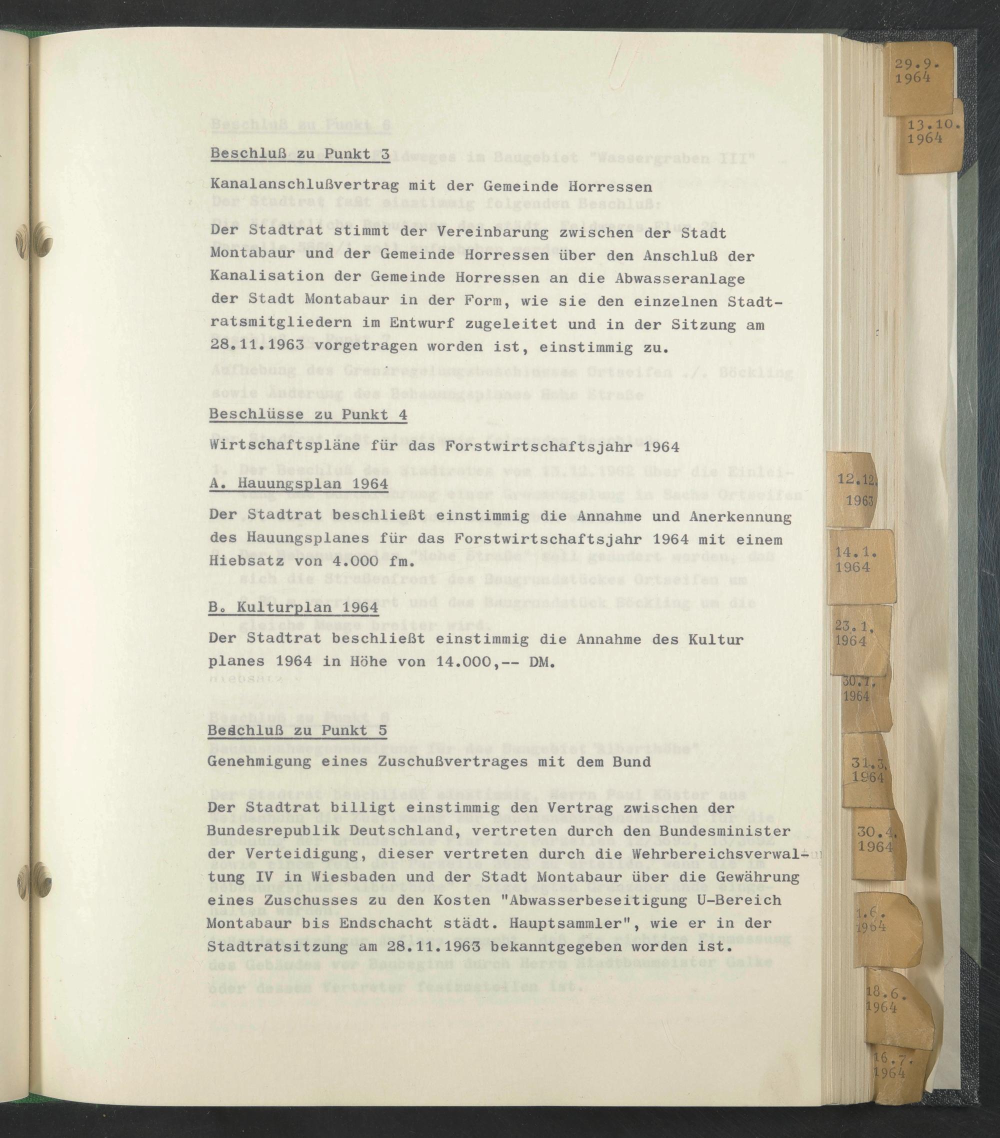 Der Stadtrat billigt einstimmig den Vertrag zwischen der Bundesrepublik Deutschland, vertreten durch den Bundesminister der Verteidigung, dieser vertreten durch die Wehrbereichsverwal-i tung IV in Wiesbaden und der Stadt Montabaur über die Gewährung eines Zuschusses zu den Kosten "Abwasserbeseitigung U-Bereich Montabaur bis Endschacht städt. Hauptsammler", wie er in der Stadtratsitzung am 28.11.1963 bekanntgegeben worden ist.