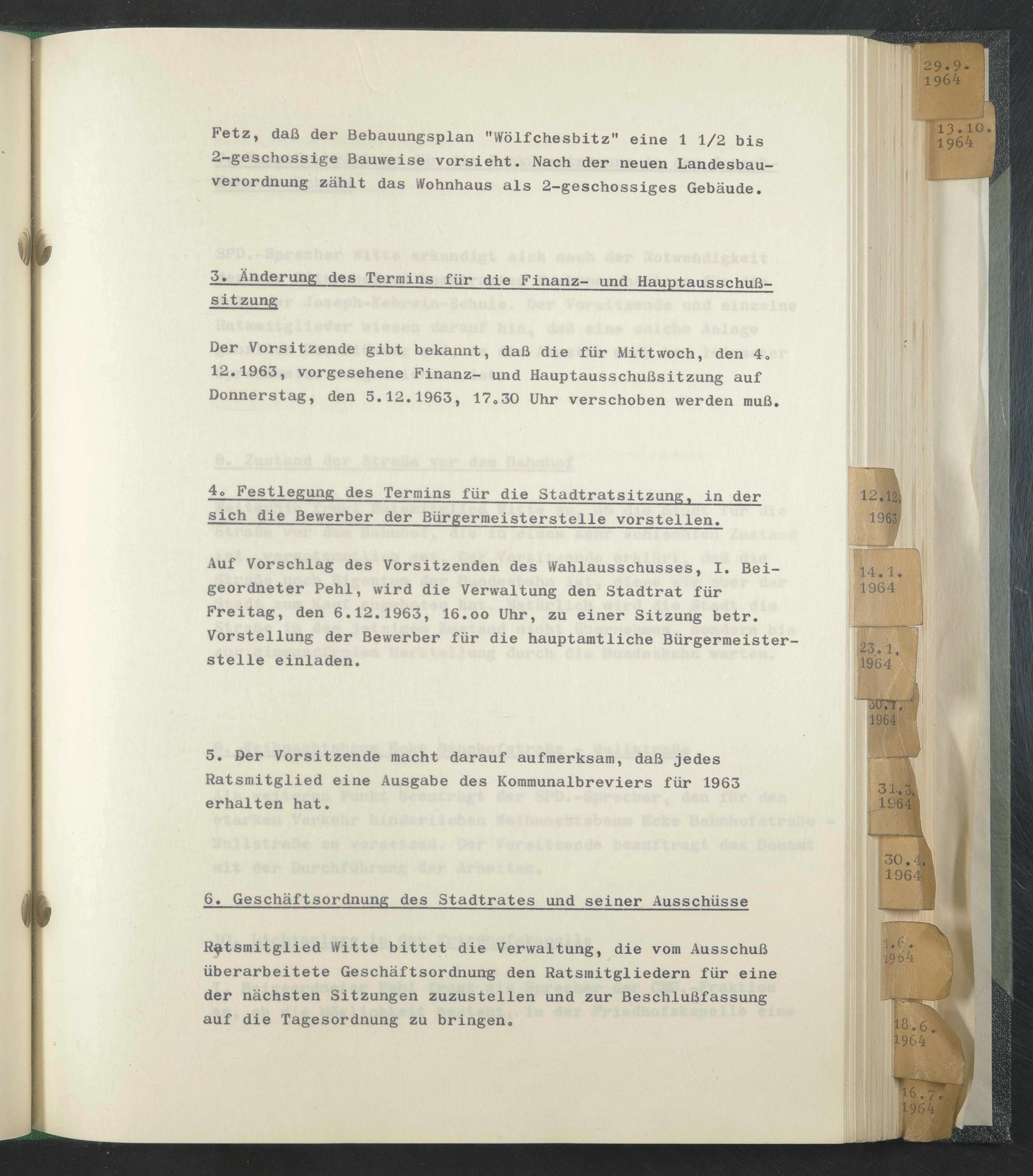 Auf Vorschlag des Vorsitzenden des Wahlausschusses, I. Beigeordneter Pehl, wird die Verwaltung den Stadtrat für Freitag, den 6.12.1963, 16.oo Uhr, zu einer Sitzung betr. Vorstellung der Bewerber für die hauptamtliche Bürgermeisterstelle einladen.