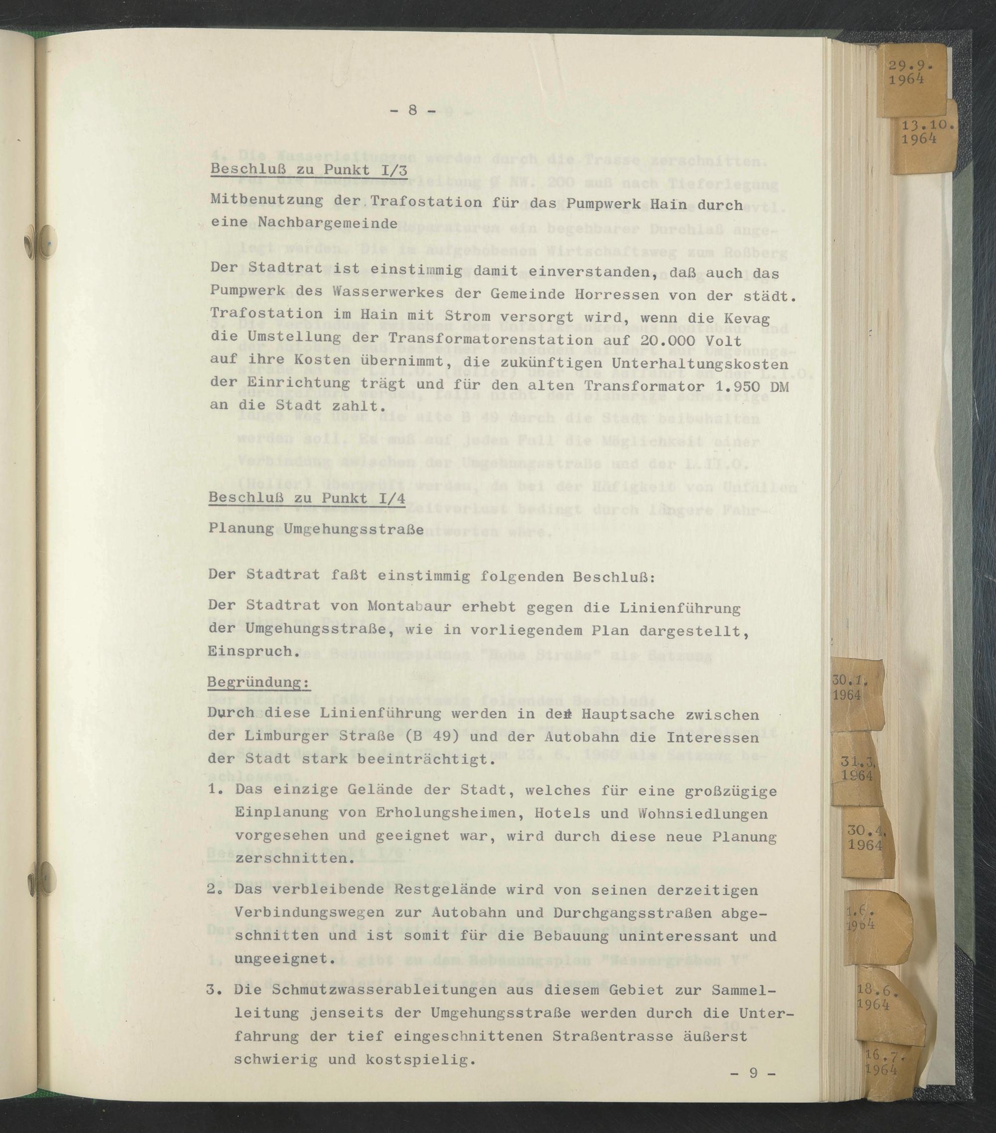 Der Stadtrat ist einstimmig damit einverstanden, daß auch das Pumpwerk des Wasserwerkes der Gemeinde Horressen von der städt. Trafostation im Hain mit Strom versorgt wird, wenn die Kevag die Umstellung der Transformatorenstation auf 20.000 Volt auf ihre Kosten übernimmt, die zukünftigen Unterhaltungskosten der Einrichtung trägt und für den alten Transformator 1.950 DM an die Stadt zahlt.