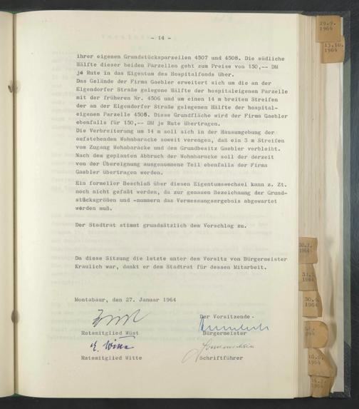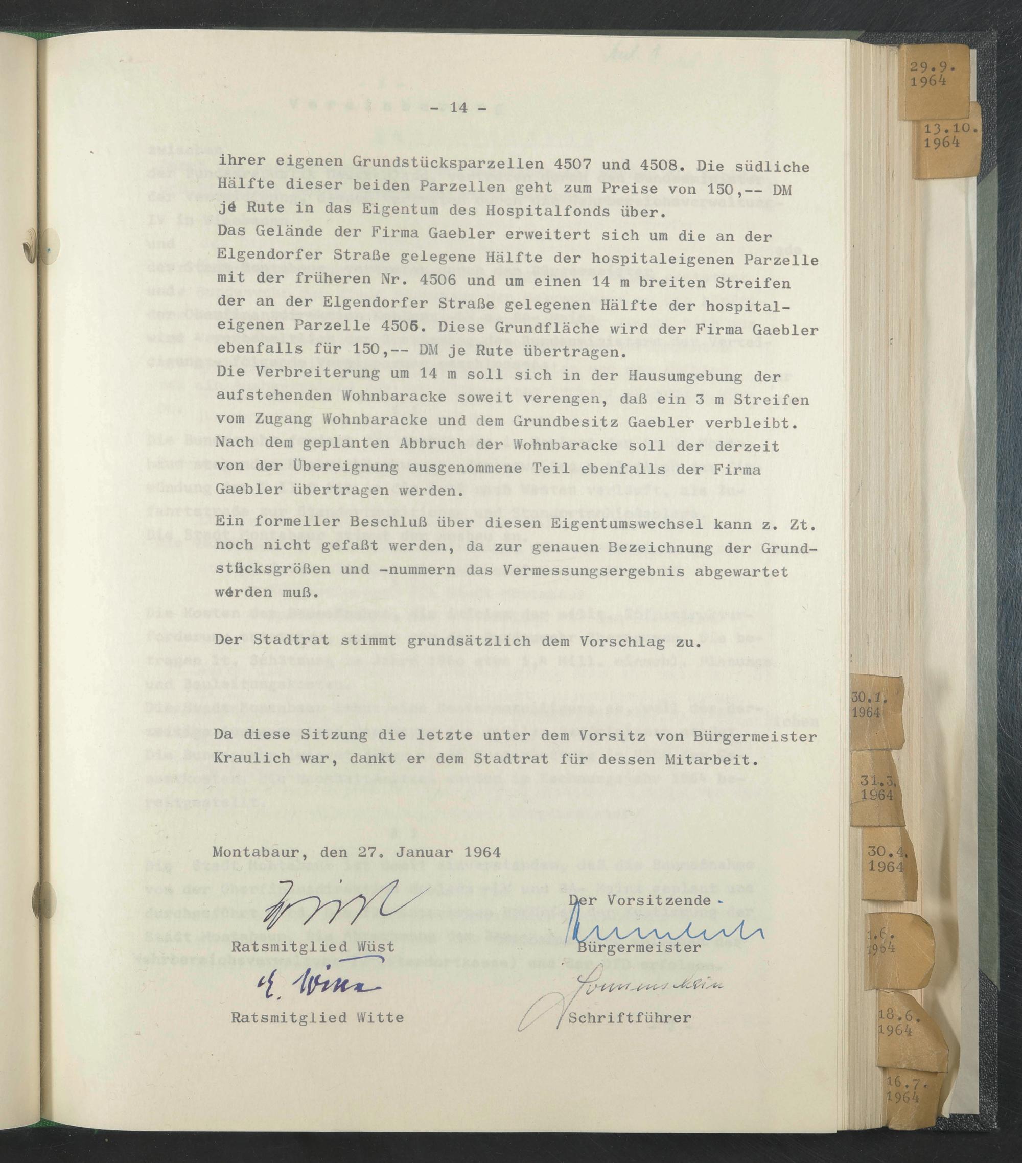 Ein formeller Beschluß über diesen Eigentumswechsel kann z. Zt. noch nicht gefaßt werden, da zur genauen Bezeichnung der Grundstücksgrößen und -nummern das Vermessungsergebnis abgewartet werden muß.