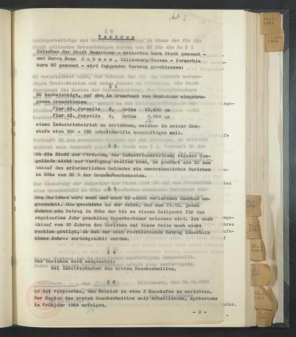 Zwischen der Stadt Montabaur - weiterhin kurz Stadt genannt - tmd Herrn Hans C o h n a n , Dilleaburg/Hessen - fernerhin kurz HC genannt — wird folgender Vertrag geschlossen: