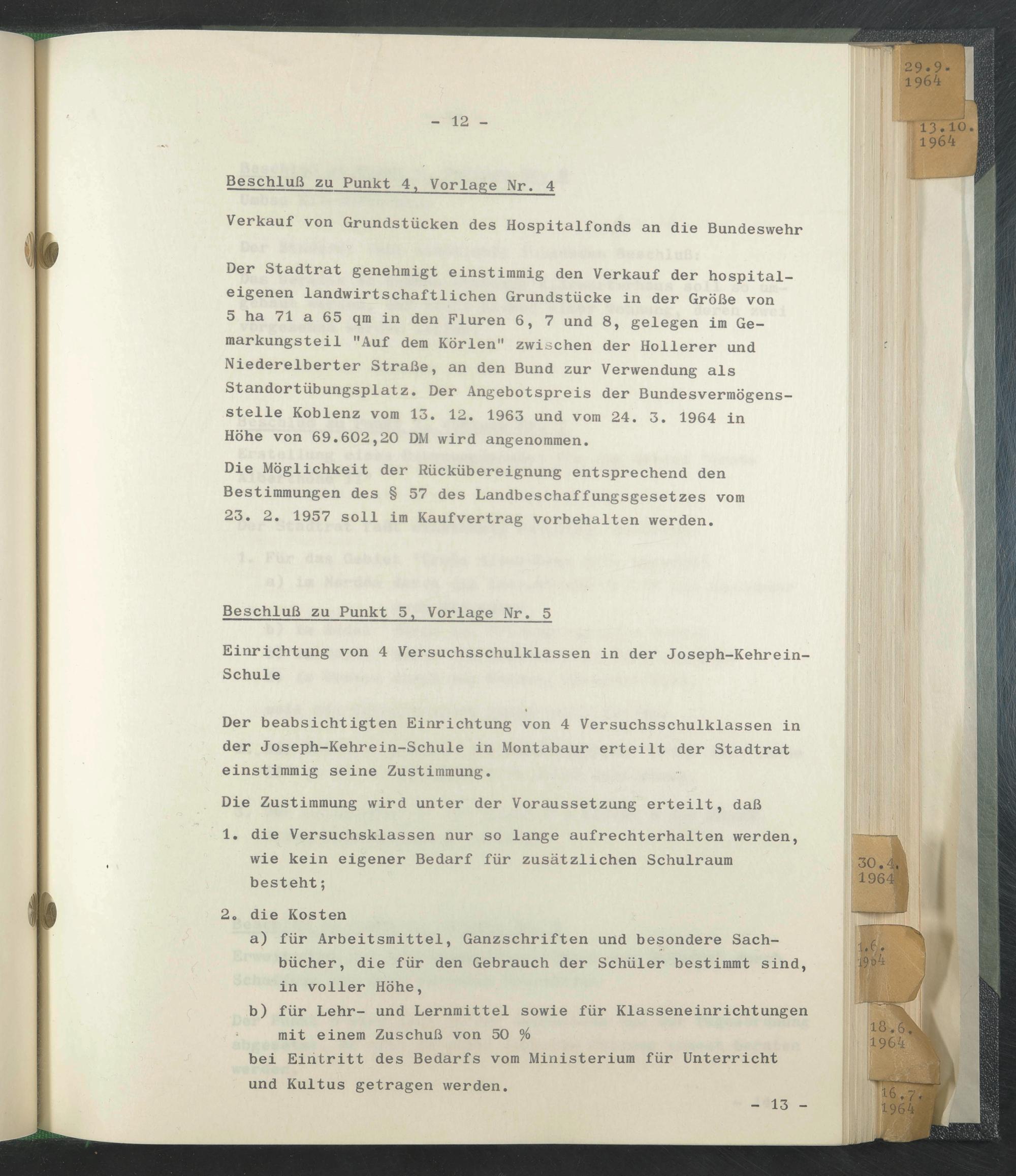 Der Stadtrat genehmigt einstimmig den Verkauf der hospitaleigenen landwirtschaftlichen Grundstücke in der Größe von 5 ha 71 a 65 qm in den Fluren 6, 7 und 8, gelegen im Gemarkungsteil "Auf dem Körlen" zwischen der Hollerer und Niederelberter Straße, an den Bund zur Verwendung als Standortübungsplatz. Der Angebotspreis der Bundesvermögensstelle Koblenz vom 13. 12. 1963 und vom 24. 3. 1964 in Höhe von 69.602,20 DM wird angenommen.