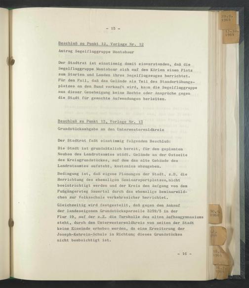 Der Stadtrat ist einstimmig damit einverstanden, daß die Segelfluggruppe Montabaur sich auf dem Körlen einen Platz zum Starten und Landen ihres Segelflugzeuges herrichtet.
