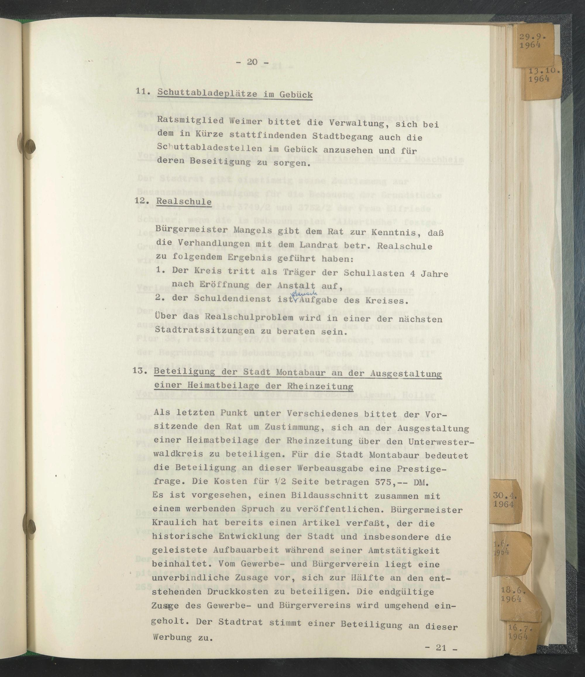 Als letzten Punkt unter Verschiedenes bittet der Vorsitzende den Rat um Zustimmung, sich an der Ausgestaltung einer Heimatbeilage der Rheinzeitung über den Unterwester waldkreis zu beteiligen. Für die Stadt Montabaur bedeutet die Beteiligung an dieser Werbeausgabe eine Prestigefrage. Die Kosten für V2 Seite betragen 573,— DM.