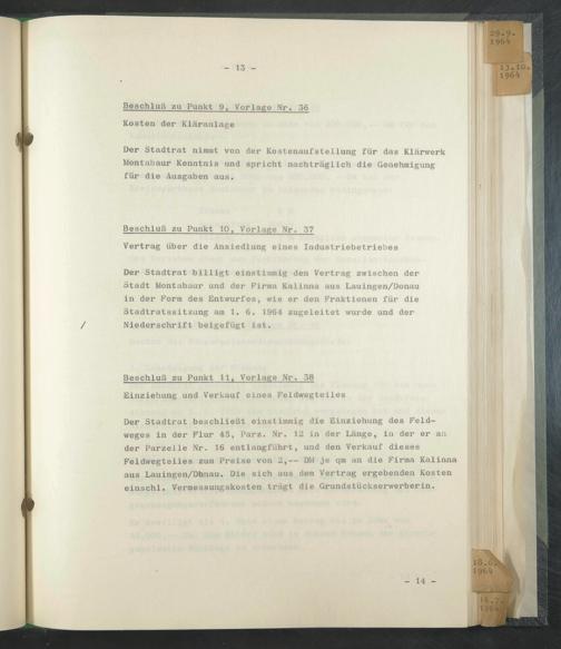 Der Stadtrat billigt einstimmig den Vertrag zwischen der Stadt Montabaur und der Firma Kalinna aus Lauingen/Donau in der Form des Entwurfes, wie er den Fraktionen für die Stadtratssitzung am 1. 6. 1964 zugeleitet wurde und der Niederschrift beigefügt ist.