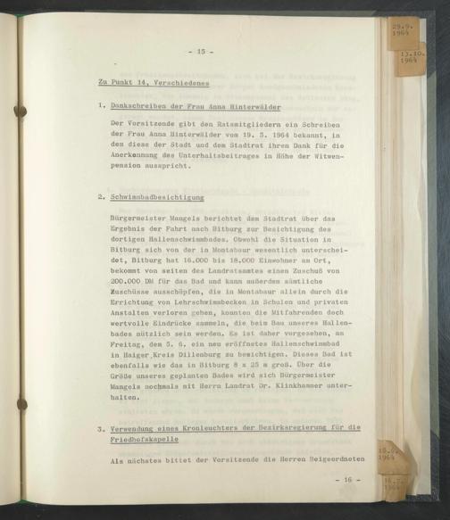 Bürgermeister Mangels berichtet dem Stadtrat über das Ergebnis der Fahrt nach Bitburg zur Besichtigung des dortigen Hallenschwimmbades. Obwohl die Situation in Bitburg sich von der in Montabaur wesentlich unterscheidet, Bitburg hat 16.000 bis 18.000 Einwohner am Ort, bekommt von seiten des Landratsamtes einen Zuschuß von 200.000 DM für das Bad und kann außerdem sämtliche Zuschüsse ausschöpfen, die in Montabaur allein durch die Errichtung von Lehrschwimmbecken in Schulen und privaten Anstalten verloren gehen, konnten die Mitfahrenden doch wertvolle Eindrücke sammeln, die beim Bau unseres Hallenbades nützlich sein werden. Es ist daher vorgesehen, am Freitag, dem 5. 6. ein neu eröffnetes Hallenschwimmbad in Haiger,Kreis Dillenburg zu besichtigen. Dieses Bad ist ebenfalls wie das in Bitburg 8 x 25 m groß. Uber die Größe unseres geplanten Bades wird sich Bürgermeister Mangels nochmals mit Herrn Landrat Dr. Klinkhammer unterhalten.