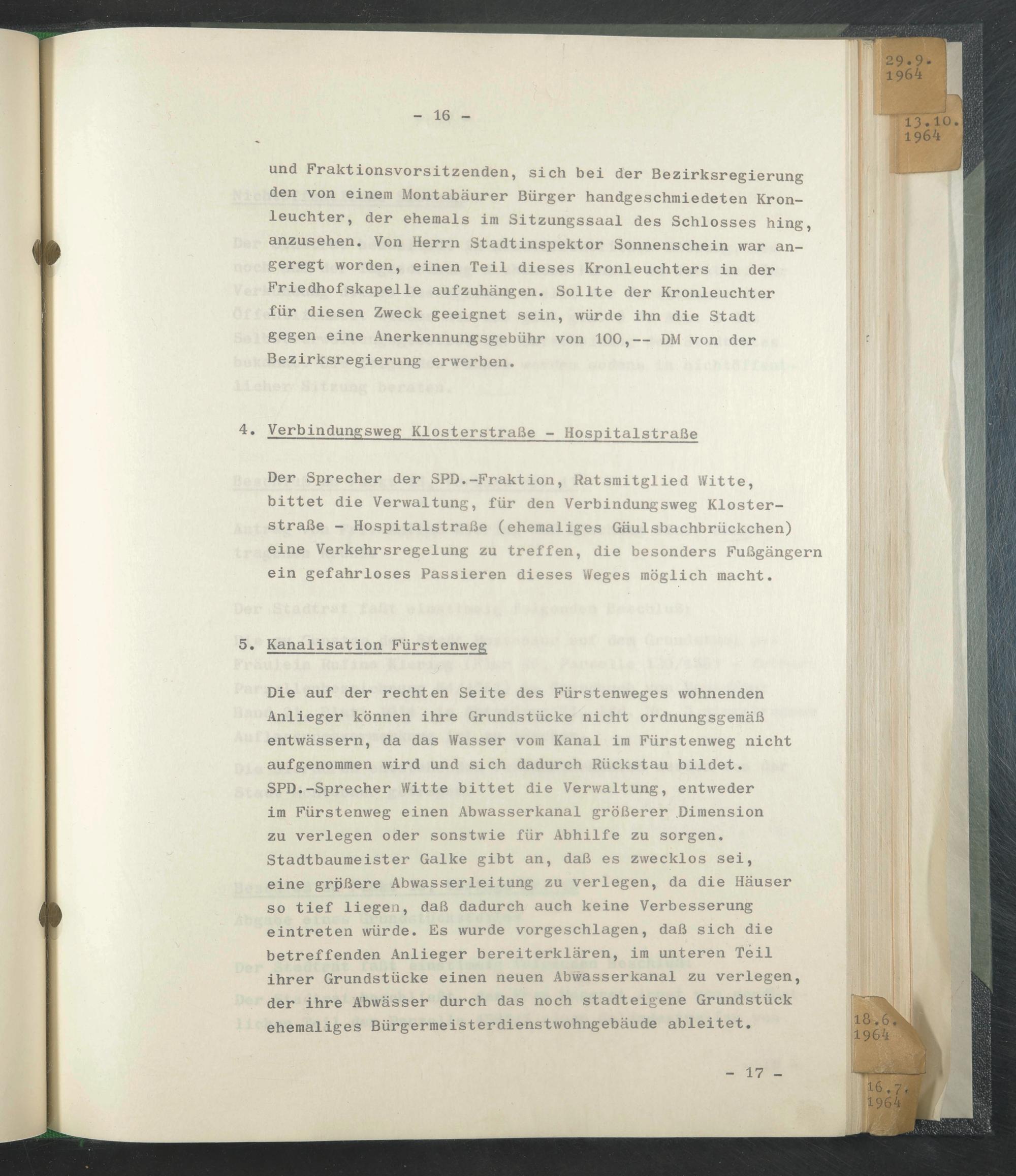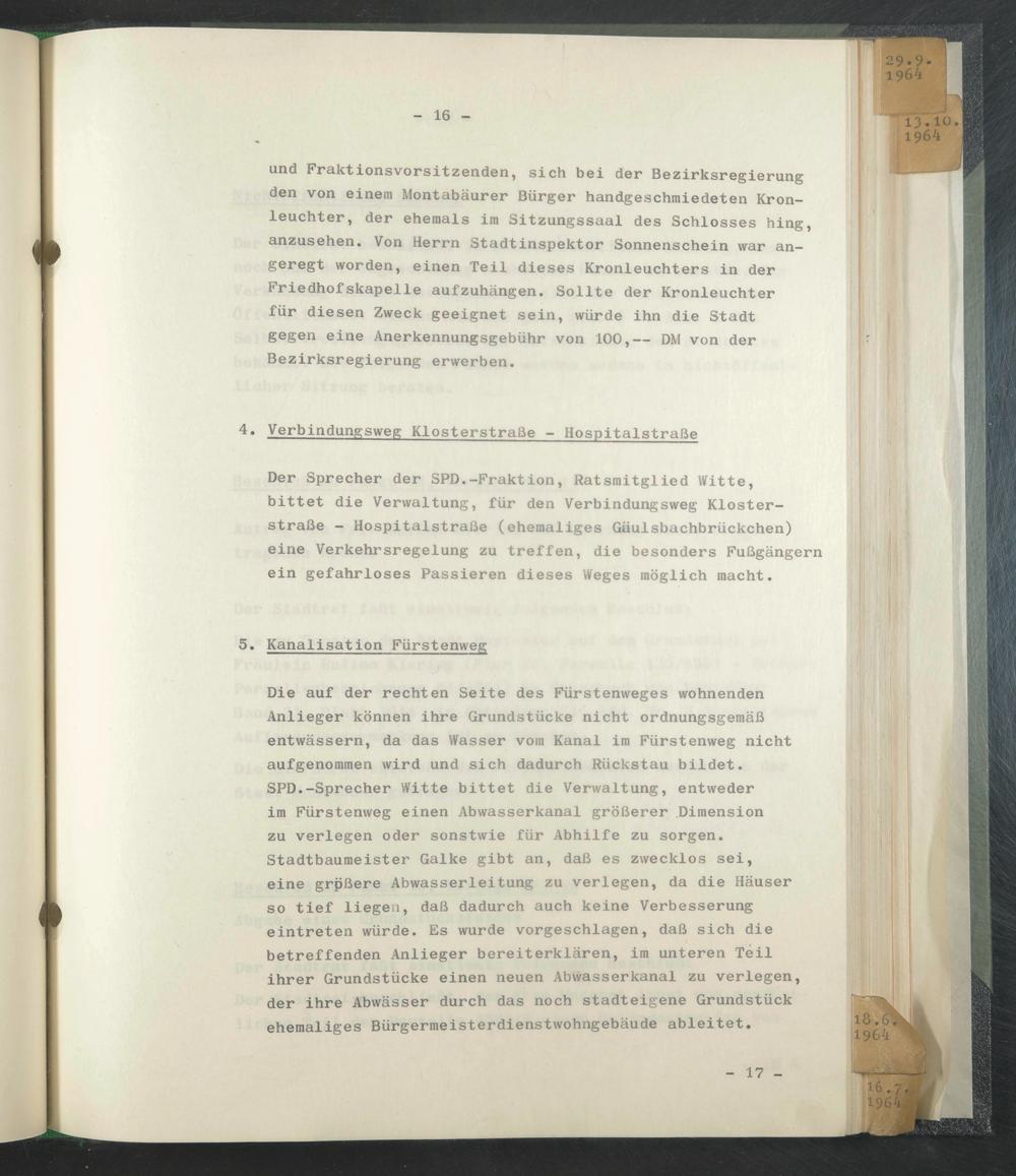 Der Sprecher der SPD.-Fraktion, Ratsmitglied Witte, bittet die Verwaltung, für den Verbindungsweg Klosterstraße - Hospitalstraße (ehemaliges Gäulsbachbrückchen) eine Verkehrsregelung zu treffen, die besonders Fußgängern ein gefahrloses Passieren dieses Weges möglich macht.