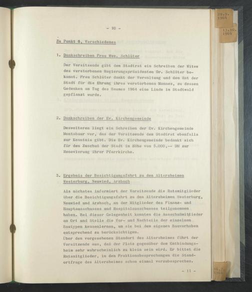 Der Vorsitzende gibt dem Stadtrat ein Schreiben der Witwe des verstorbenen Regierungspräsidenten Dr. Schlüter bekannt. Frau Schlüter dankt der Verwaltung und dem Rat der Stadt für die Ehrung ihres verstorbenen Mannes, zu dessen Gedenken am Tag des Baumes 1964 eine Linde im Stadtwald gepflanzt wurde.