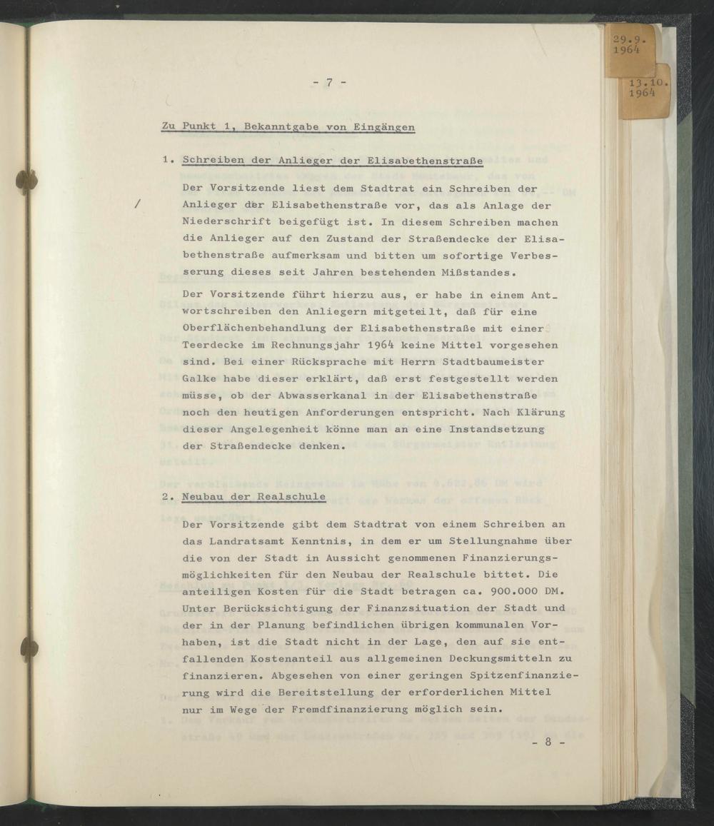 Der Vorsitzende führt hierzu aus, er habe in einem Antwortschreiben den Anliegern mitgeteilt, daß für eine Oberflächenbehandlung der Elisabethenstraße mit einer^ Teerdecke im Rechnungsjahr 1964 keine Mittel vorgesehen sind. Bei einer Rücksprache mit Herrn Stadtbaumeister Galke habe dieser erklärt, daß erst festgestellt werden müsse, ob der Abwasserkanal in^der Elisabethenstraße noch den heutigen Anforderungen entspricht. Nach Klärung dieser Angelegenheit könne man an eine Instandsetzung der Straßendecke denken.
