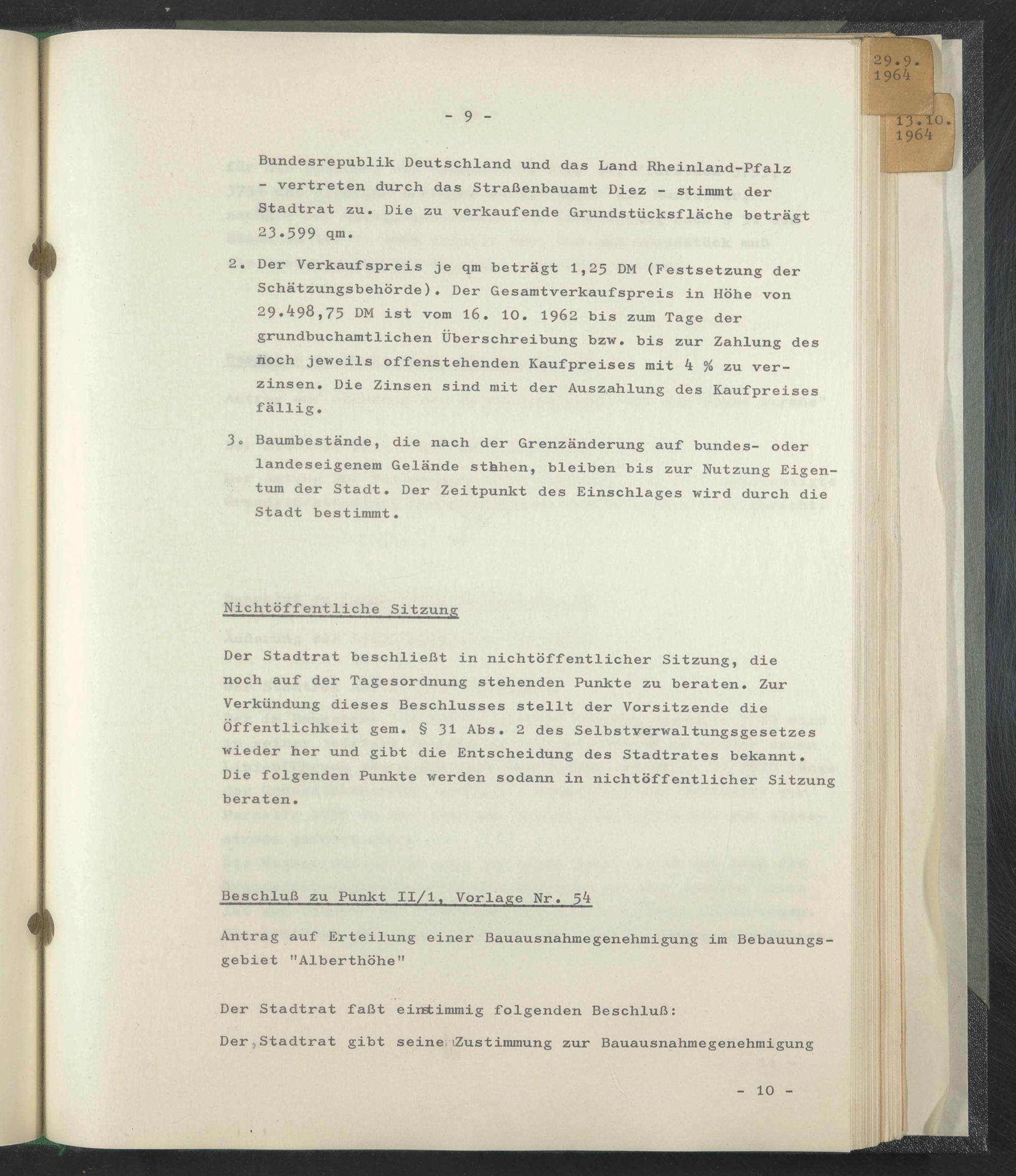 Bundesrepublik Deutschland und das Land Rheinland-Pfalz - vertreten durch das Straßenbauamt Diez - stimmt der Stadtrat zu. Die zu verkaufende Grundstücksfläche beträgt 23.599 qm.