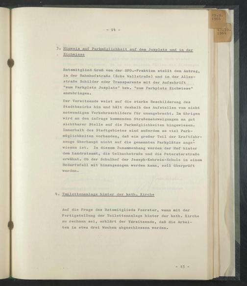 Auf die Frage des Ratsmitglieds Foerster, wann mit der Fertigstellung der Toilettenanlage hinter der kath. Kirche zu rechnen sei, erklärt der Vorsitzende, daß die Arbeiten in etwa drei Wochen abgeschlossen werden.