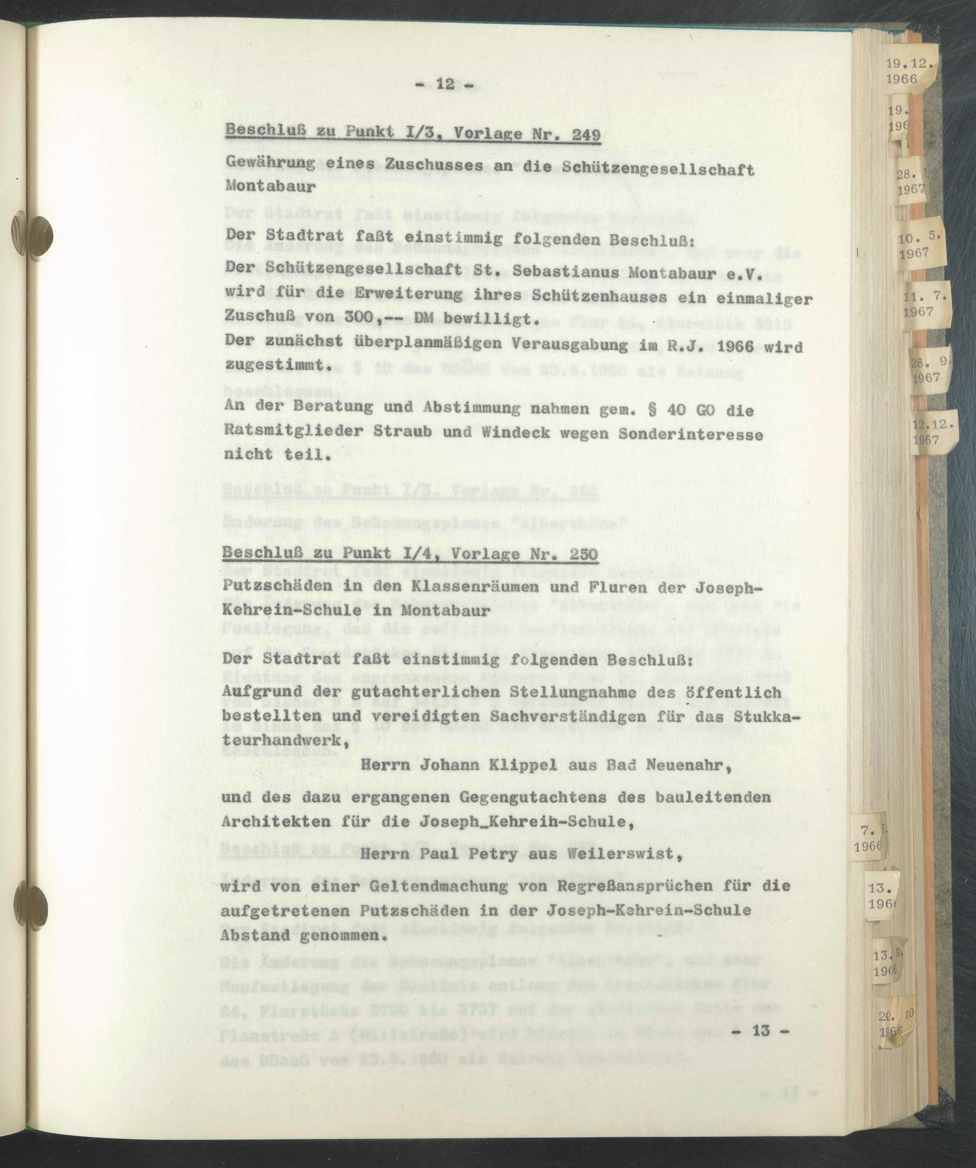Der Schützengesellschaft St. Sebastianus Montabaur e.V. wird für die Erweiterung ihres Schützenhauses ein einmaliger Zuschuß von 300,— DM bewilligt.