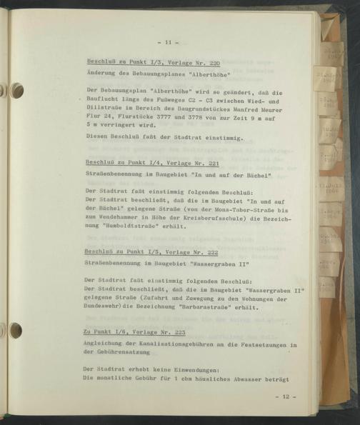 Der Stadtrat beschließt, daß die im Baugebiet "Wassergraben II" gelegene Straße (Zufahrt und Zuwegung zu den Wohnungen der Bundeswehr)die Bezeichnung "Barbarastraße" erhält.