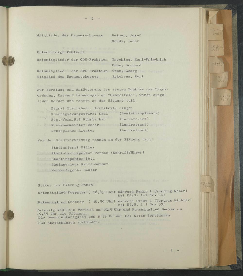 Zur Beratung und Erläuterung des ersten Punktes der Tagesordnung, Entwurf Bebauungsplan "Himmelfeld", waren eingeladen worden und nahmen an der Sitzung teil: