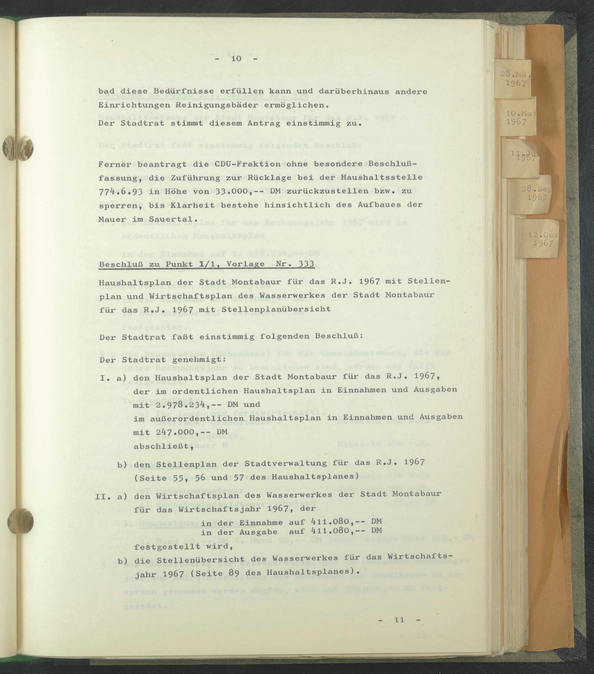 Haushaltsplan der Stadt Montabaur für das R.J. 1967 mit Stellenplan und Wirtschaftsplan des Wasserwerkes der Stadt Montabaur für das R.J. 1967 mit Stellenplanübersicht
