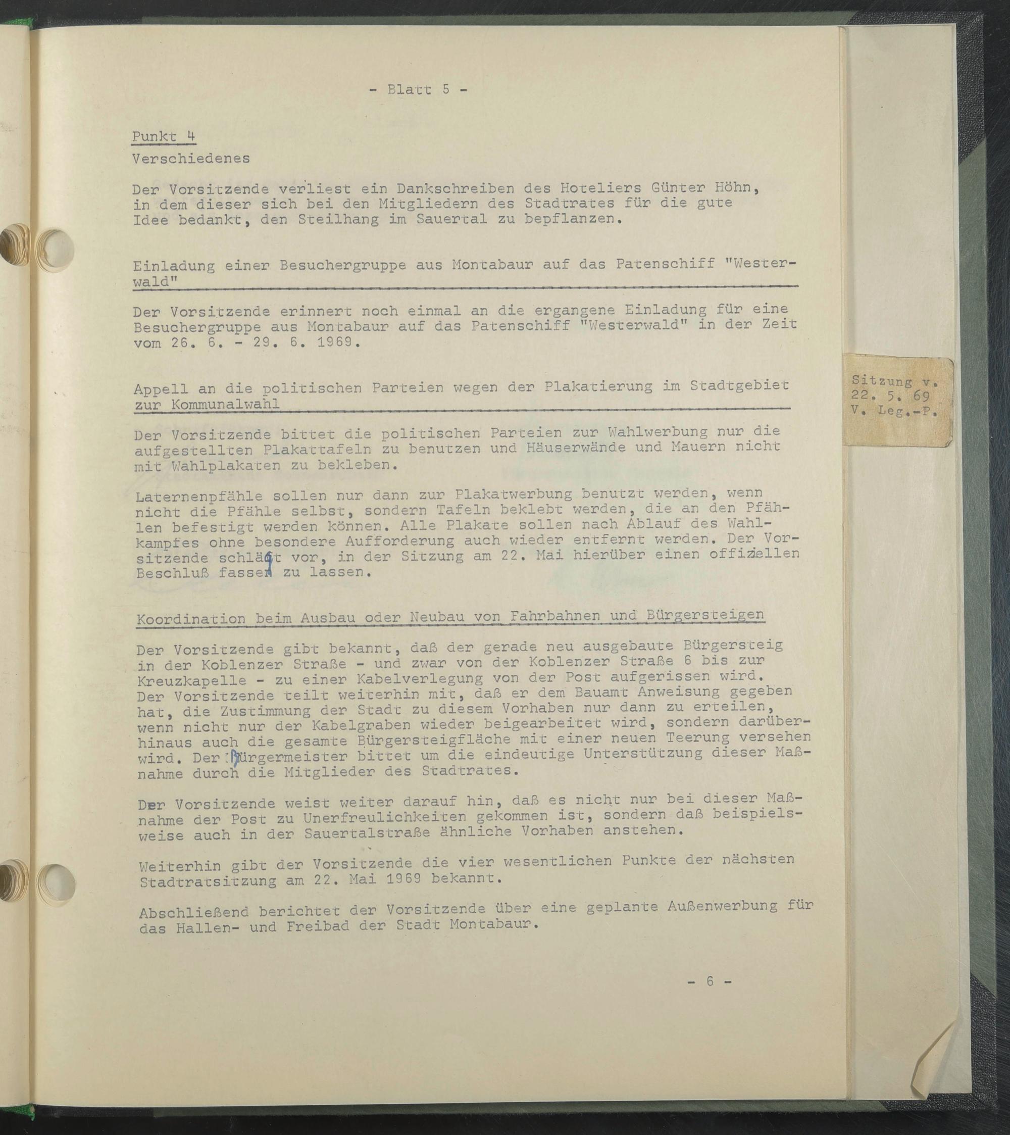 Weiterhin gibt der Vorsitzende die vier wesentlichen Punkte der nächsten Stadtratsitzung am 22. Mai 1969 bekannt.