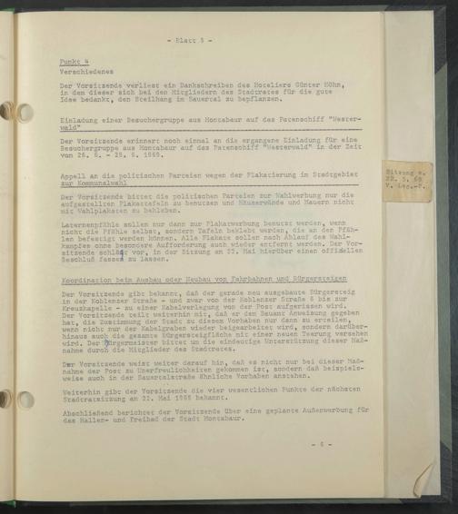 Laternenpfähle sollen nur dann zur Plakatwerbung benutzt werden, wenn nicht die Pfähle selbst, sondern Tafeln beklebt werden, die an den Pfählen befestigt werden können. Alle Plakate sollen nach Ablauf des Wahlkampfes ohne besondere Aufforderung auch wieder entfernt werden. Der Vorsitzende schlädt vor, in der Sitzung am 22. Mai hierüber einen offiziellen Beschluß fassen zu lassen.
