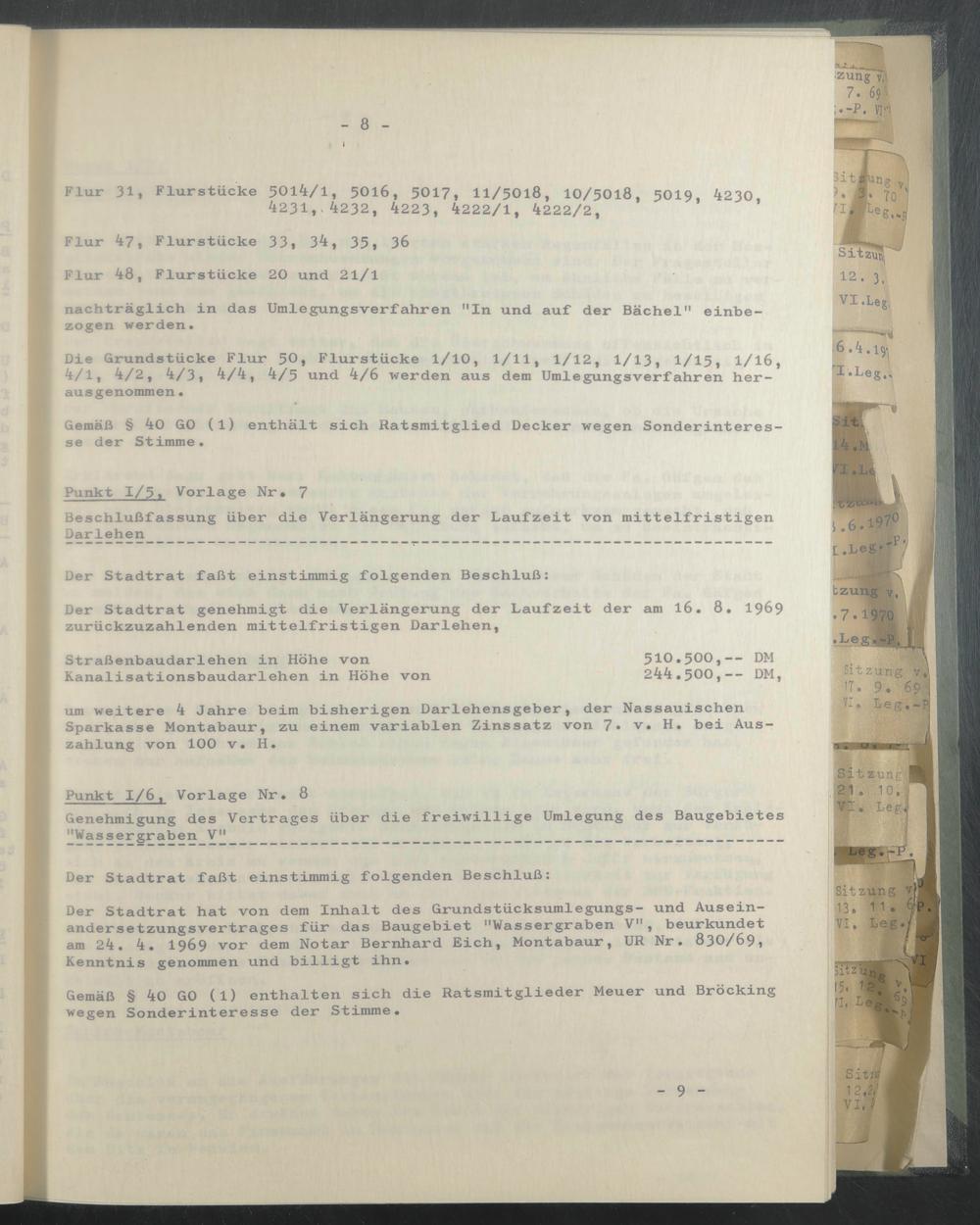 Der Stadtrat hat von dem Inhalt des Grundstücksumlegungs- und Auseinandersetzungsvertrages für das Baugebiet "Wassergraben V", beurkundet am 24. 4. 1969 vor dem Notar Bernhard Eich, Montabaur, UR Nr. 830 / 69 , Kenntnis genommen und billigt ihn.