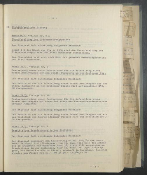 Der Stadtrat genehmigt den Kaufvertrag UR Nr. 1205/69 des Herrn Notar Bernhard Eich, Montabaur, vom 11. Juni 1969 über den Ankauf des im Grundbuch von Montabaur Band 38, Blatt 1789 verzeichneten Grundstückes in der Eichwiese, Flur 25, Parz. Nr. 3990 = 679 groß, von Herrn Karl-Heinz Häuser, wohnhaft in Montabaur, Sauertalstraße, zum Preise von 20,— DM je qm = 13*580, DM.