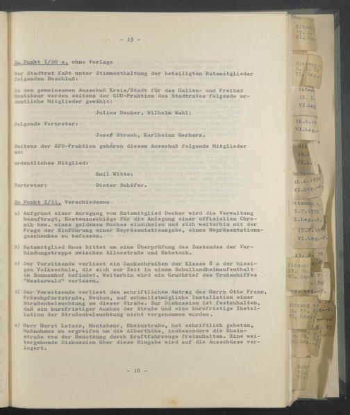 a) Aufgrund einer Anregung von Ratsmitglied Decker wird die Verwaltung beauftragt, Kostenanschläge für die Anlegung einer offiziellen Chronik bzw. eines goldenen Buches einzuholen und sich weiterhin mit der Frage der Einführung einer Repräsentationsgabe, eines Repräsentationsgeschenkes zu befassen.