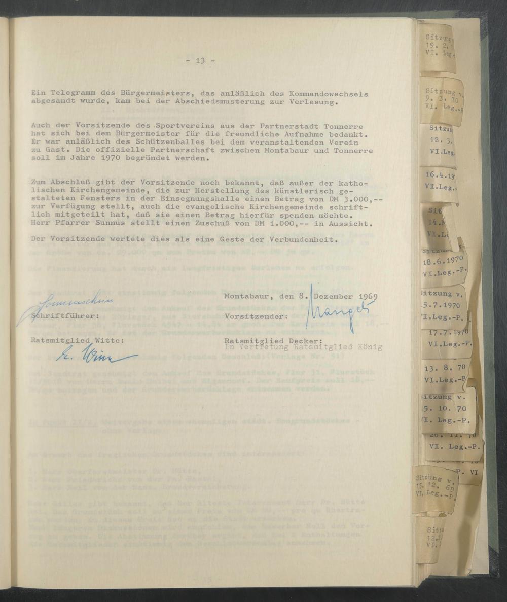Auch der Vorsitzende des Sportvereins aus der Partnerstadt Tonnerre hat sich bei dem Bürgermeister für die freundliche Aufnahme bedankt. Er war anläßlich des Schützenballes bei dem veranstaltenden Verein zu Gast. Die offizielle Partnerschaft zwischen Montabaur und Tonnerre soll im Jahre 1970 begründet werden.