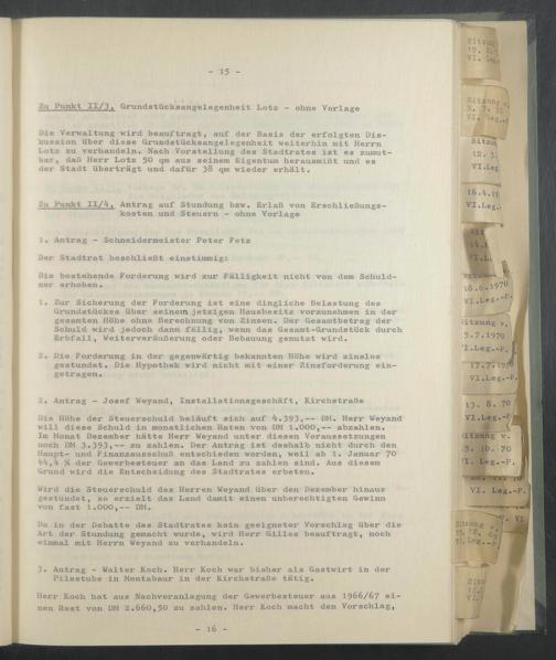 Im Monat Dezember hätte Herr Weyand unter diesen Voraussetzungen noch DM 3.393,-- zu zahlen. Der Antrag ist deshalb nicht durch den Haupt- und Finanzausschuß entschieden worden, weil ab 1. Januar 70 44,4 % der Gewerbesteuer an das Land zu zahlen sind. Aus diesem Grund wird die Entscheidung des Stadtrates erbeten.