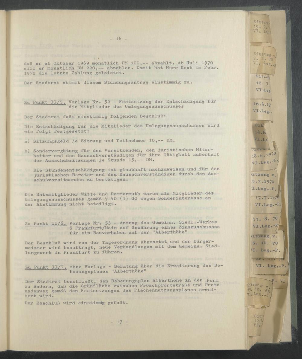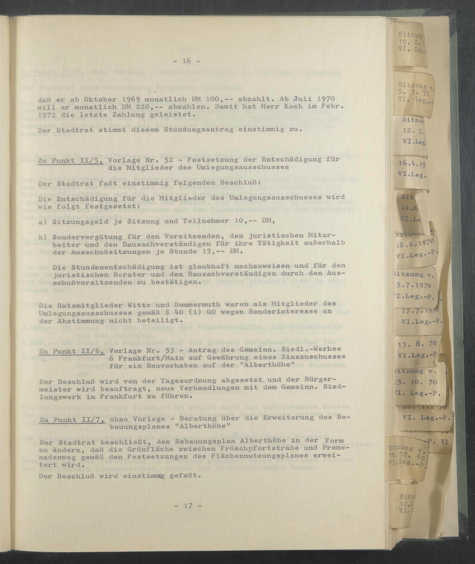 Die Ratsmitglieder Witte und Dommermuth waren als Mitglieder des Umlegungsausschusses gemäß § 40 (l) GO wegen Sonderinteresse an der Abstimmung nicht beteiligt.