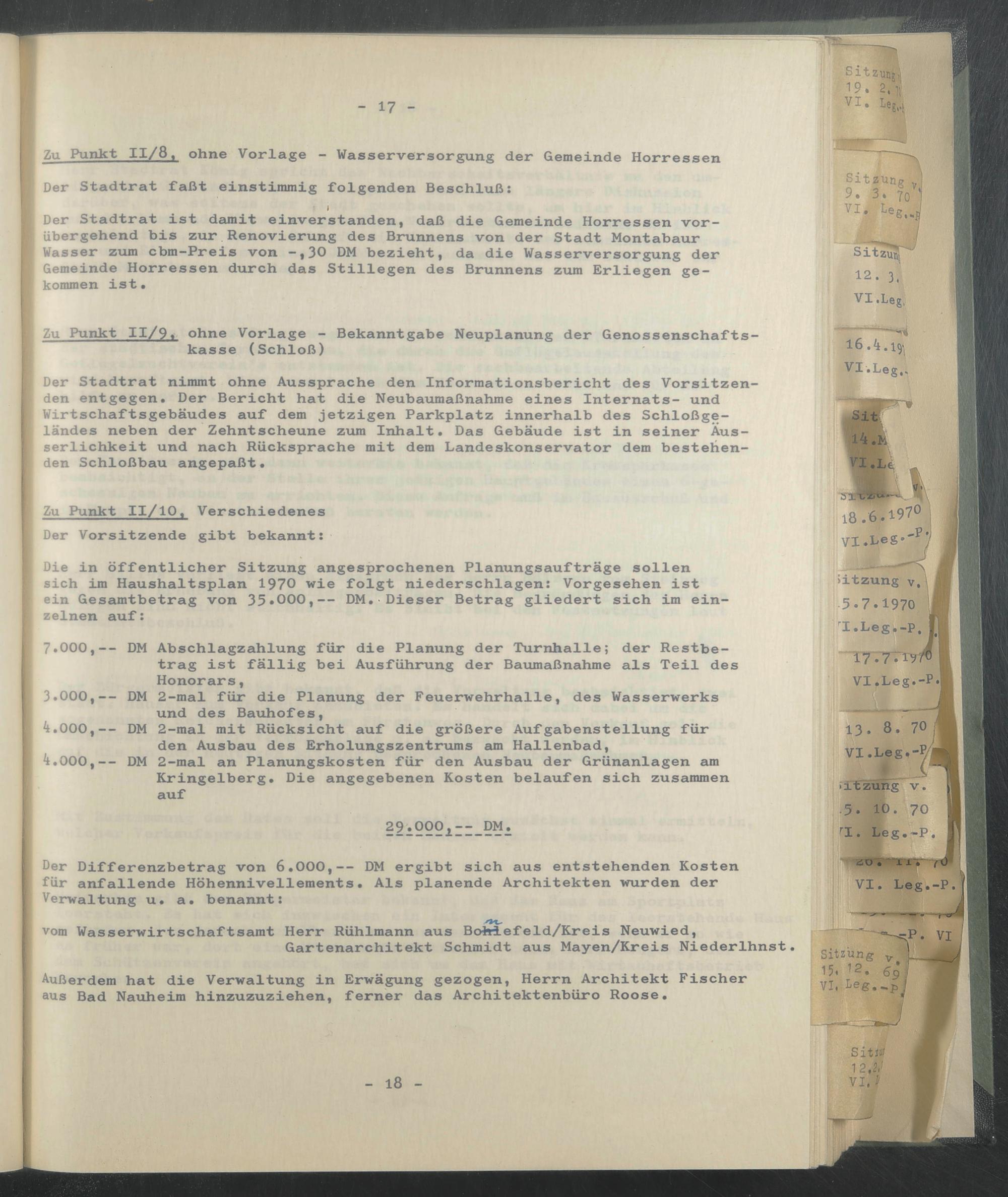 Die in öffentlicher Sitzung angesprochenen Planungsaufträge sollen sich im Haushaltsplan 1970 wie folgt niederschlagen: Vorgesehen ist ein Gesamtbetrag von 35*000,— DM. Dieser Betrag gliedert sich im einzelnen auf: