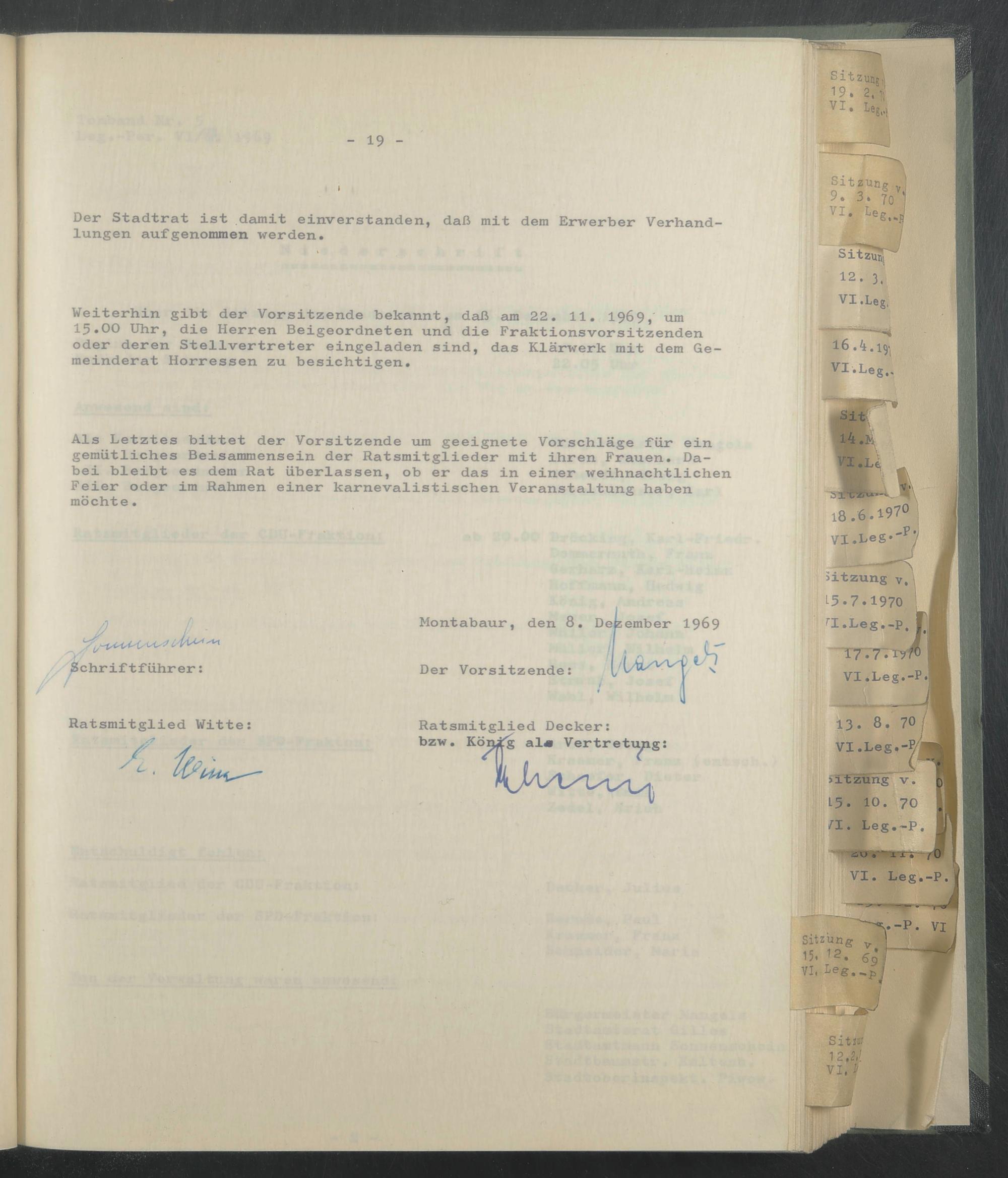 Weiterhin gibt der Vorsitzende bekannt, daß am 22. 11. 1969, um lß.OO Uhr, die Herren Beigeordneten und die Fraktionsvorsitzenden oder deren Stellvertreter eingeladen sind, das Klärwerk mit dem Gemeinderat Horressen zu besichtigen.