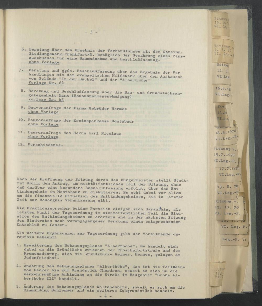 Nach der Eröffnung der Sitzung durch den Bürgermeister stellt Stadtrat König den Antrag, im nichtöffentlichen Teil der Sitzung, ohne daß darüber eine besondere Beschlußfassung erfolgt, über das Entbindungsheim in Montabaur zu diskutieren. Es geht dabei vor allem um die finanzielle Situation des Entbindungsheimes, die in letzter Zeit zur Besorgnis Veranlassung gibt.
