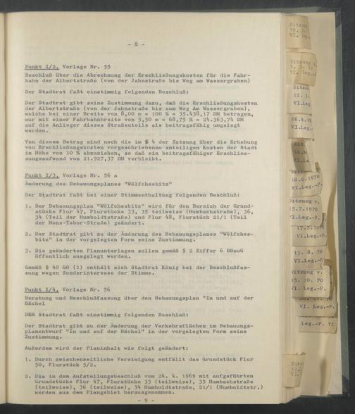 Der Stadtrat gibt seine Zustimmung dazu, daß die Erschließungskosten der Albertstraße (von der Jahnstraße bis zum Weg Am Wassergraben), welche bei einer Breite von 8,00 m = 100 % = 35*438,17 DM betragen, nur mit einer Fahrbahnbreite von 5;50 m = 68,75 % = 24.363;74 DM auf die Anlieger dieses Straßenteils als beitragsfähig umgelegt werden.